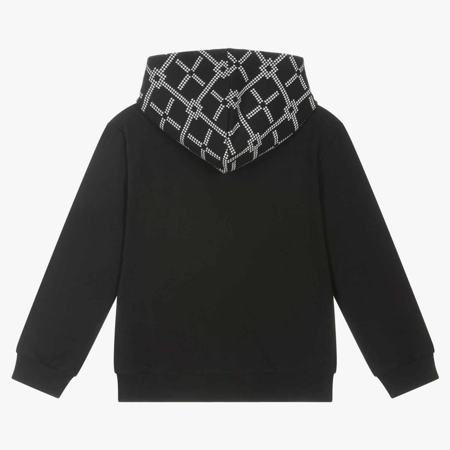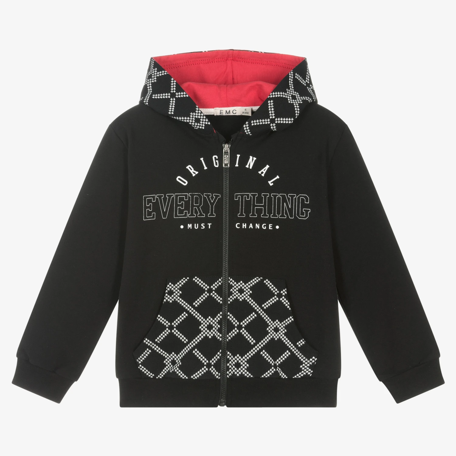 Black hooded zip-up top for boys by Everything Must Change, made in soft cotton jersey. The hood has a red jersey lining with a white checked pattern on the outside to match the front pouch pocket. There is a white logo print across the chest.
