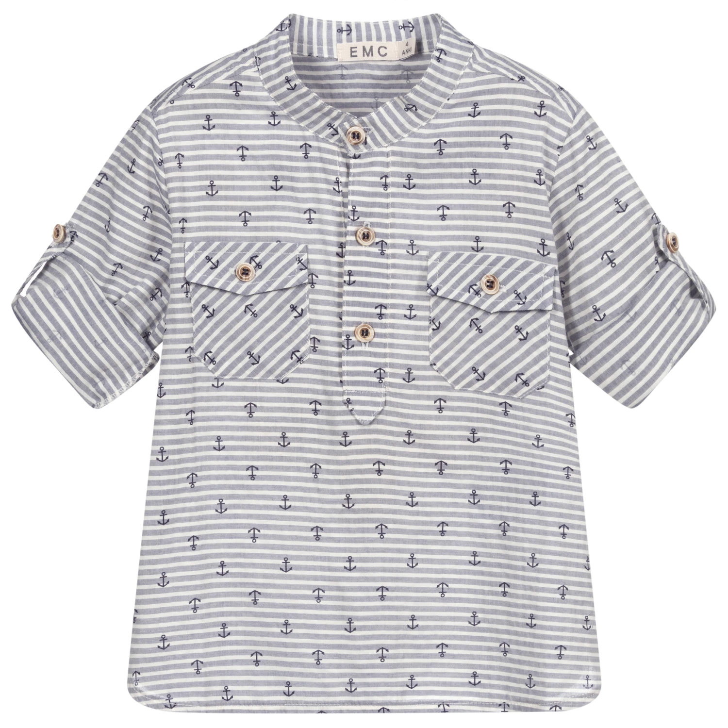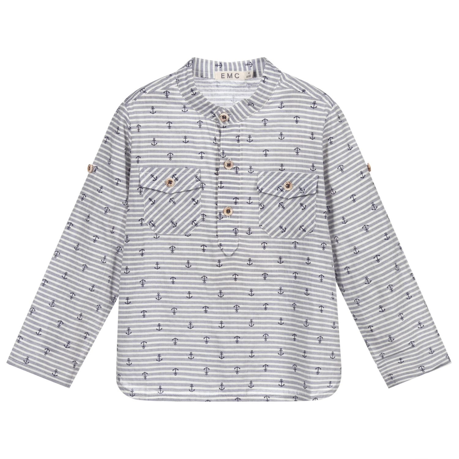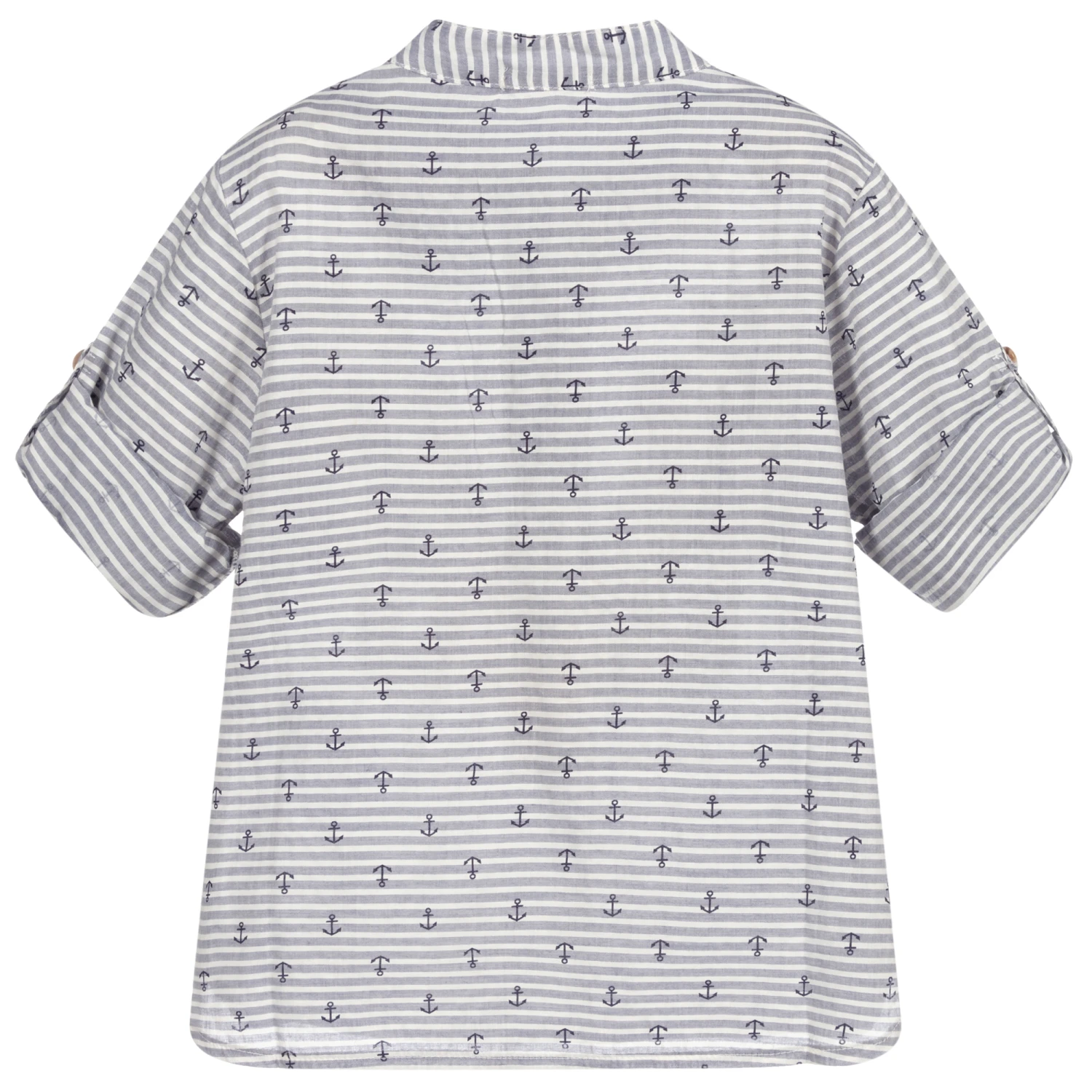 From Everything Must Change, a blue and white striped shirt for boys, with a navy blue anchor pattern. Made in a soft and lightweight cotton blend, this collarless style has a half placket opening, patch pockets and roll-up sleeves secured with a button tab.
