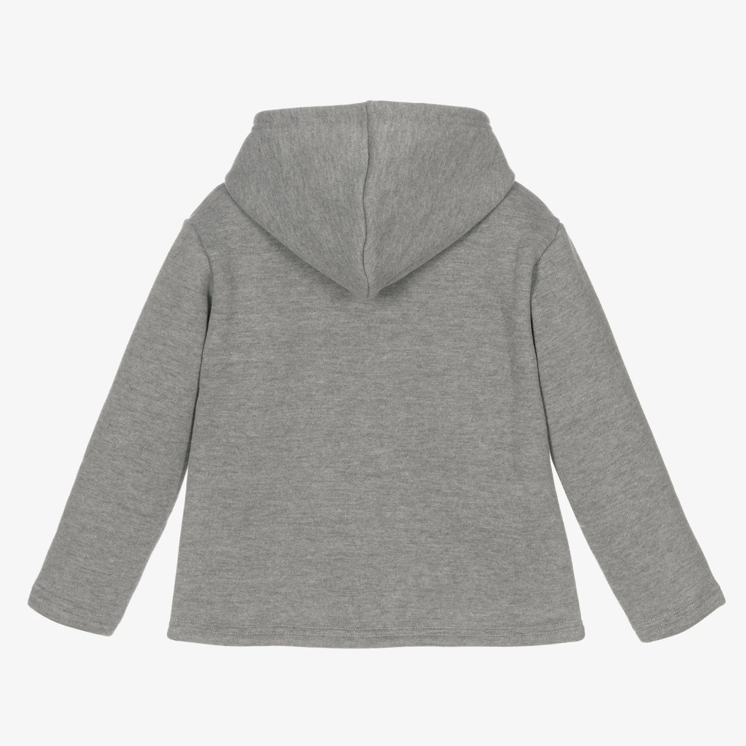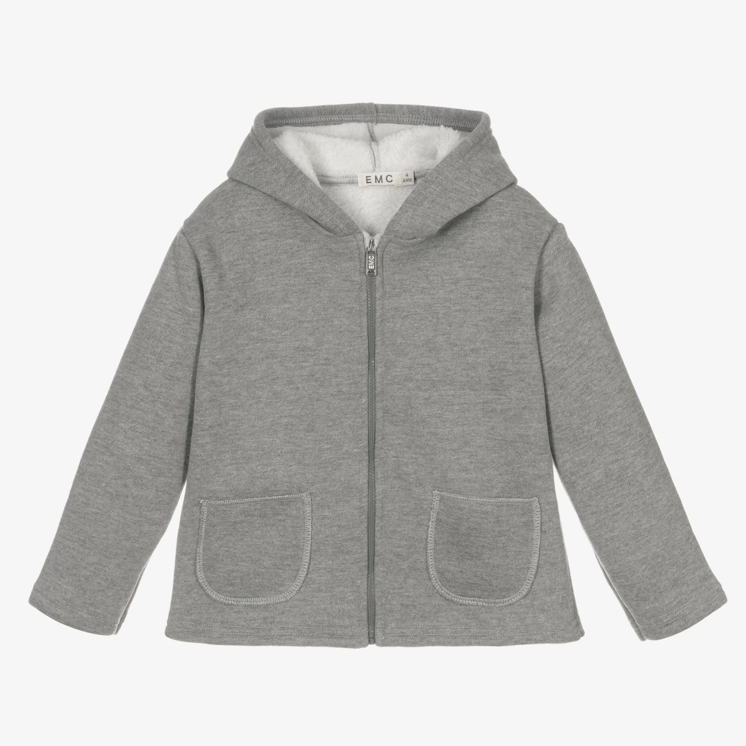Grey zip-up hooded top for younger boys by Everything Must Change. Made in soft cotton-blend jersey with a cosy fleece feel inside, it has patch pockets on the front and a branded silver metal zip pull.