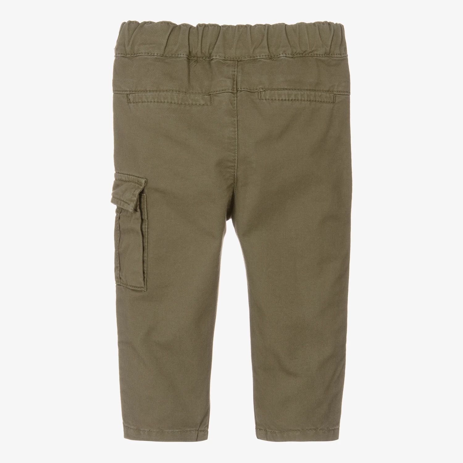 Khaki green cotton trousers for little boys from Falcotto by Naturino, made in lightweight twill. An easy pull-on style, they have an elasticated waist with faux drawstring detail and faux pockets on the front and back. For a casual cargo look, there is a large patch pocket on one leg with a tonal embroidered Chick logo on the popper-fastening flap.