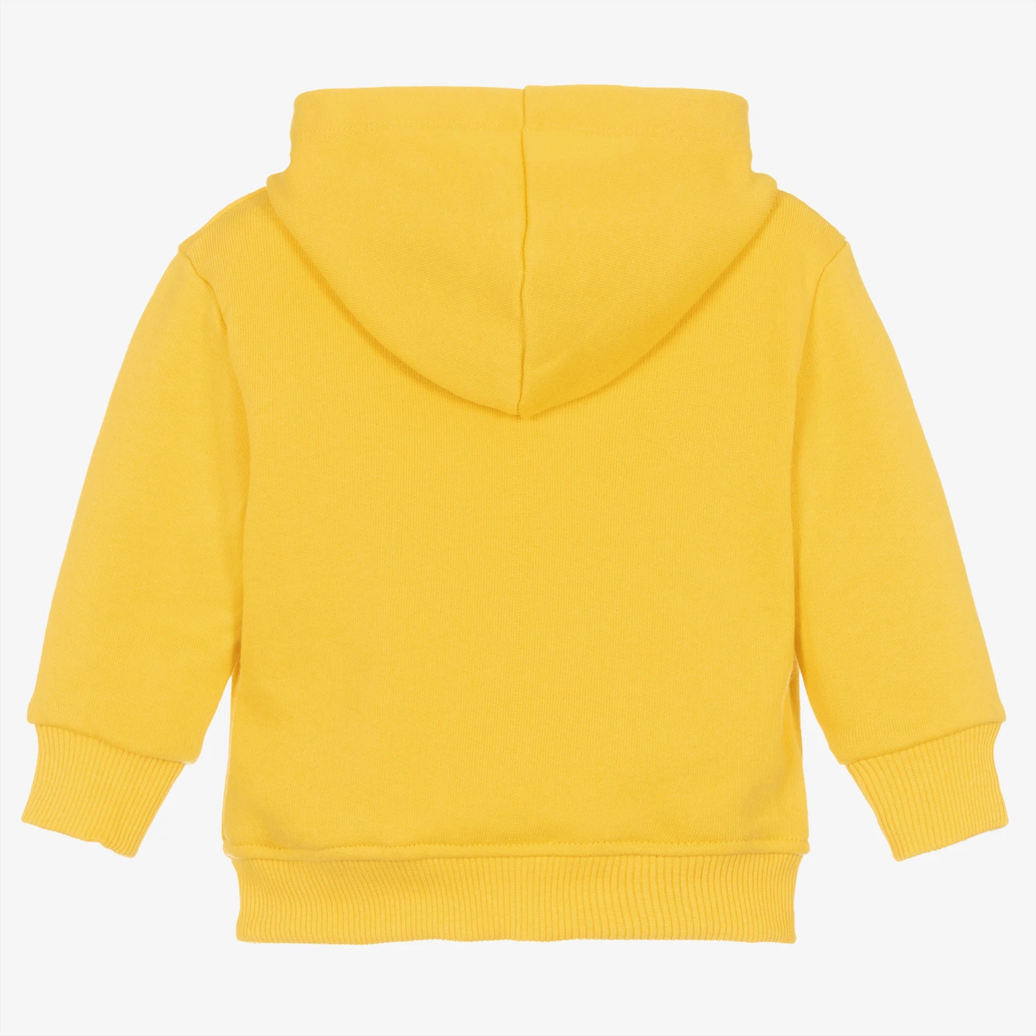 Bright yellow hooded zip-up top for little boys from Italian brand Falcotto by Naturino. Made in soft, mid-weight cotton jersey, it has ribbed trims, front pockets and a silver zip fastening. There is a fun car and surfboard print on the chest with the words ‘Happy Holidays’ printed above in black.