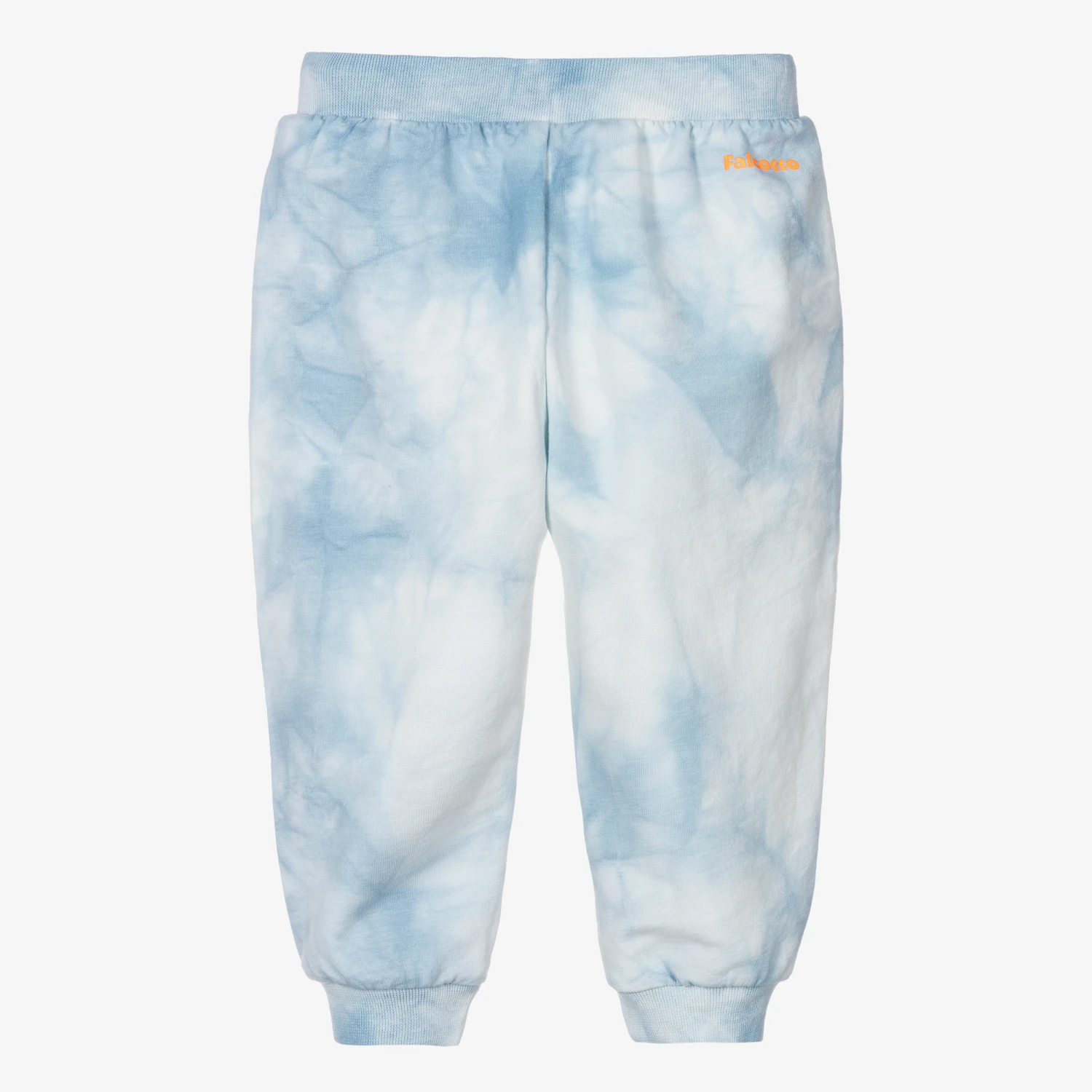 White and blue joggers for little boys and girls from Falcotto by Naturino, with a lovely tie-dye pattern. Made in soft cotton jersey, this casual cuffed style has an elasticated waist with faux drawstring and pocket details on the front. For a designer touch, the Italian brand’s logos can be seen on the front and back in neon orange print.