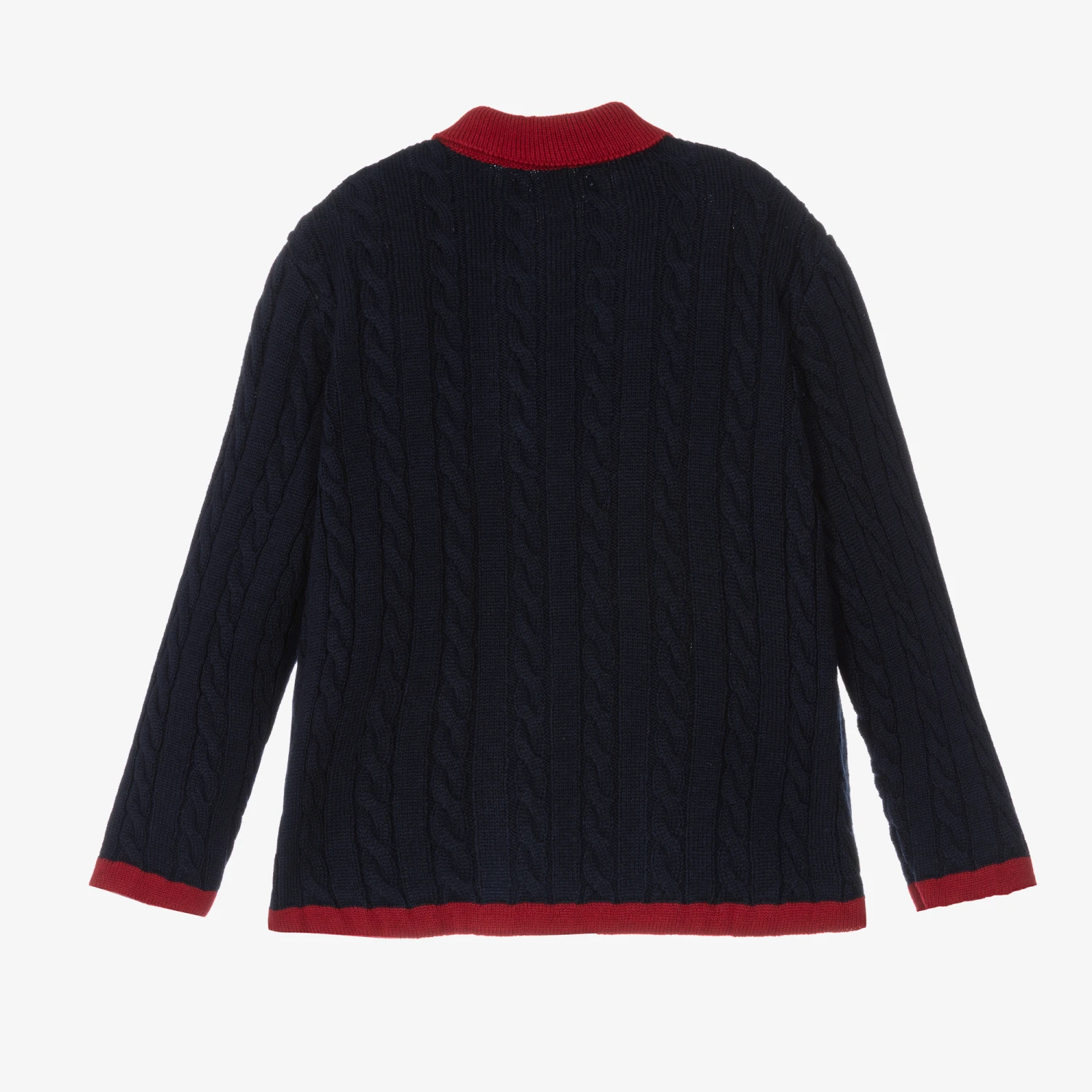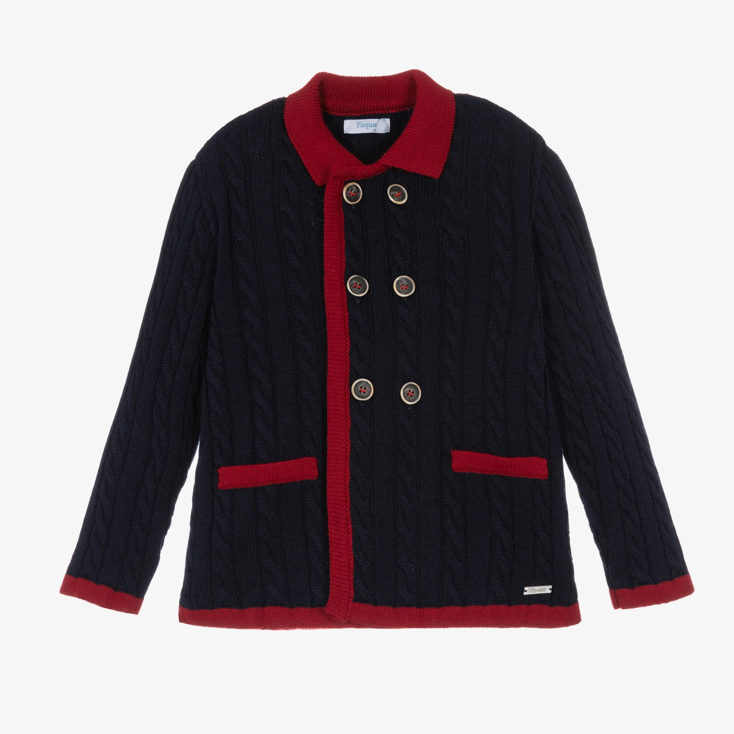 Smart navy blue cardigan for boys by Spanish brand Foque, with red trim. This soft, wool-blend cable knit is designed with a collar, faux pockets and double-breasted button fastenings for a classic look. The designer’s logo plate is stitched on the front hem.