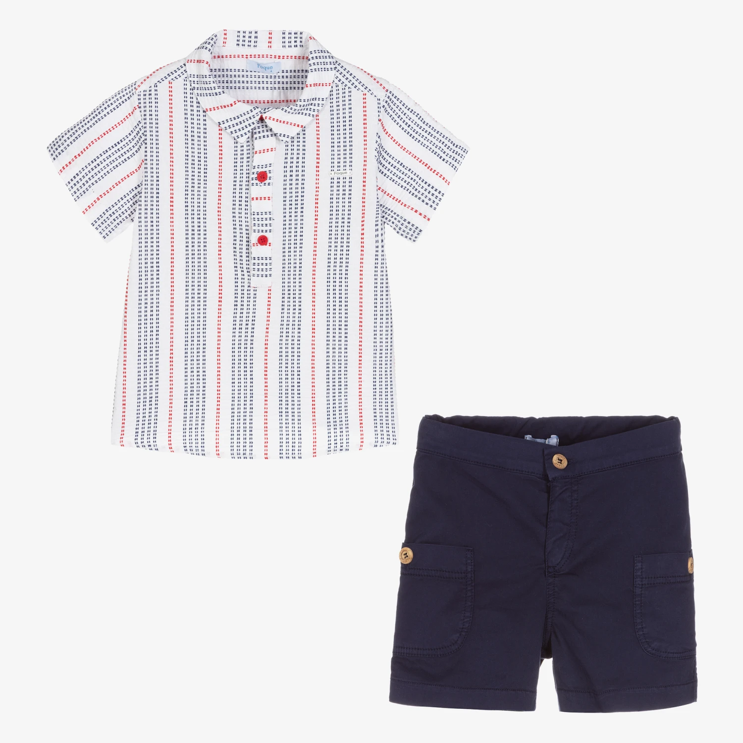 White and navy blue cotton shorts set for little boys by Foque. Made in lightweight seersucker, the short-sleeved shirt has a smart navy blue and red embroidered stripe design, red front button fastenings. The lightweight navy blue shorts are made in twill with slight stretch, with wooden button-fastening pockets on the legs and an adjustable waist.
