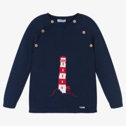 Boys navy blue sweater by Foque. Knitted in soft cotton, there is a nautical-themed lighthouse intarsia pattern on the front in red and white. There are buttons on both shoulders, one set can be undone for easy dressing and changing.