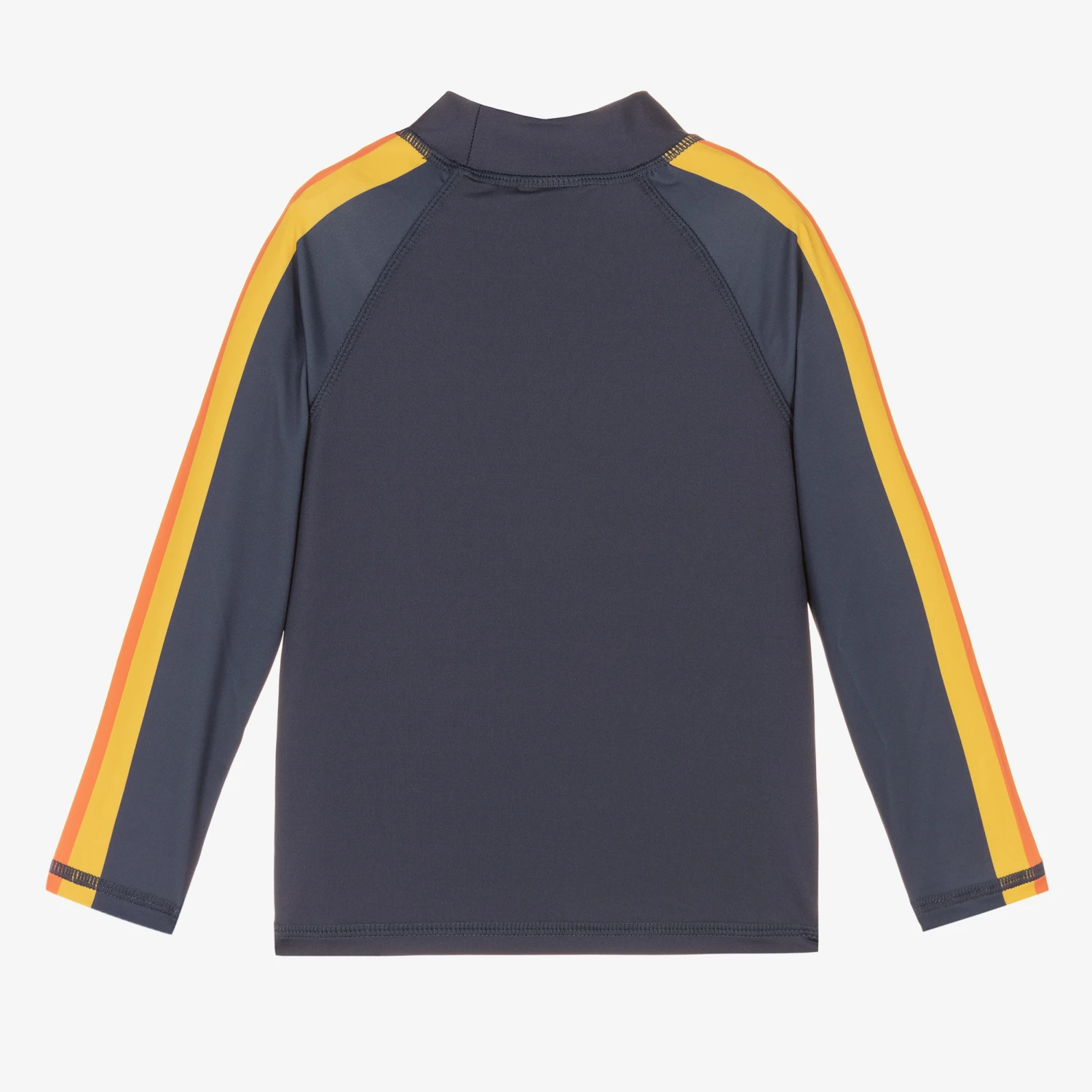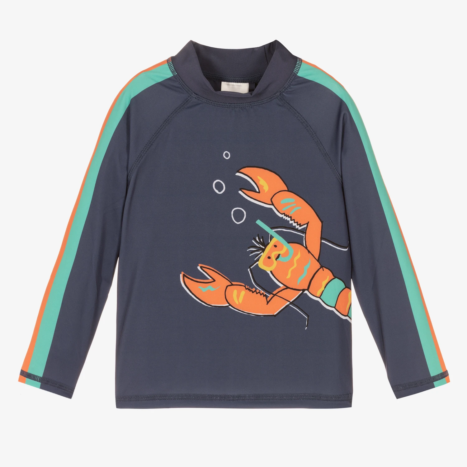 Navy blue swim top for boys by British designer Frugi, made in stretchy recycled fabric with UPF 50+. It has a fun snorkelling lobster printed on the front, with yellow, orange and green stripes on the sleeves. Designed to protect and cover, this top has long sleeves and a high neckline.