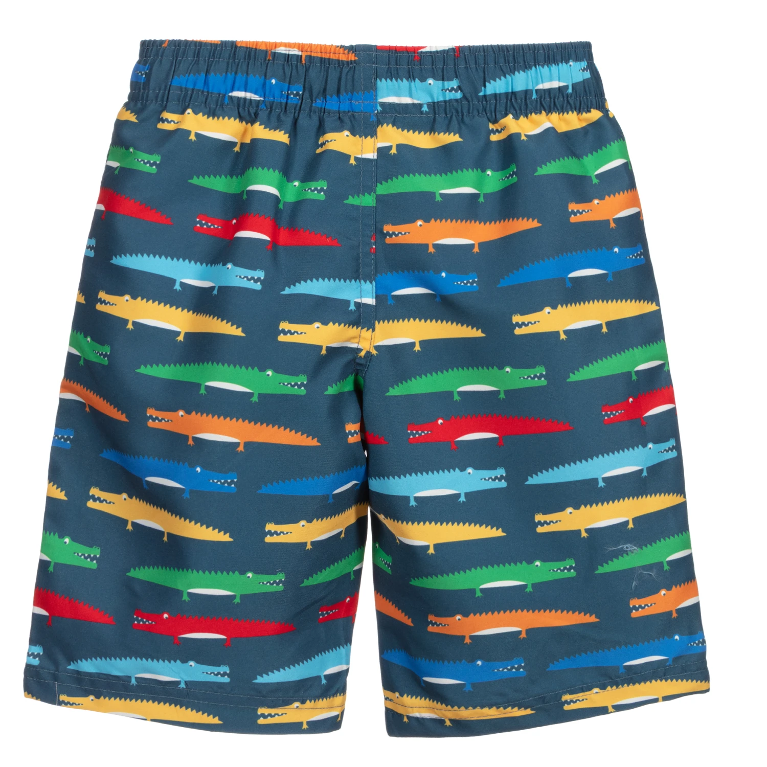 Boys blue Bermuda length swim shorts by Frugi, with a fun colourful crocodile print. Made from recycled plastic bottles, they are soft and lightweight and have a mesh lining for comfort. There is a stretchy elasticated waistband with tie fastenings on the front for a good fit.