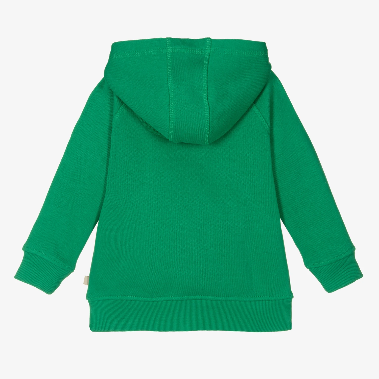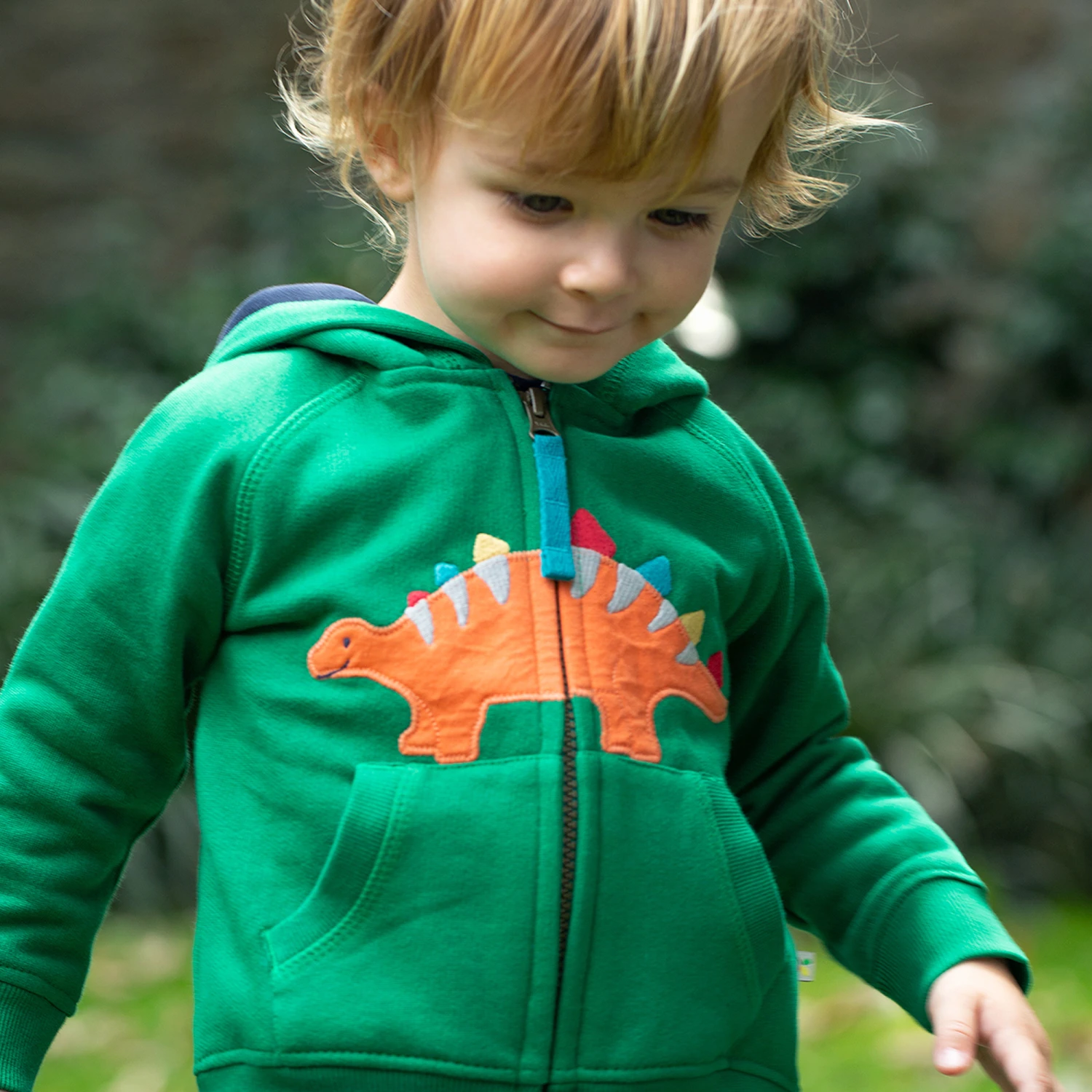 Bright green zip-up hoodie for boys by British brand Frugi, made in soft organic cotton jersey with a fleecy underside. Bold and creative, it has a colourful dinosaur embroidery on the front, cosy pockets and a zip fastening with a blue tab on the front.