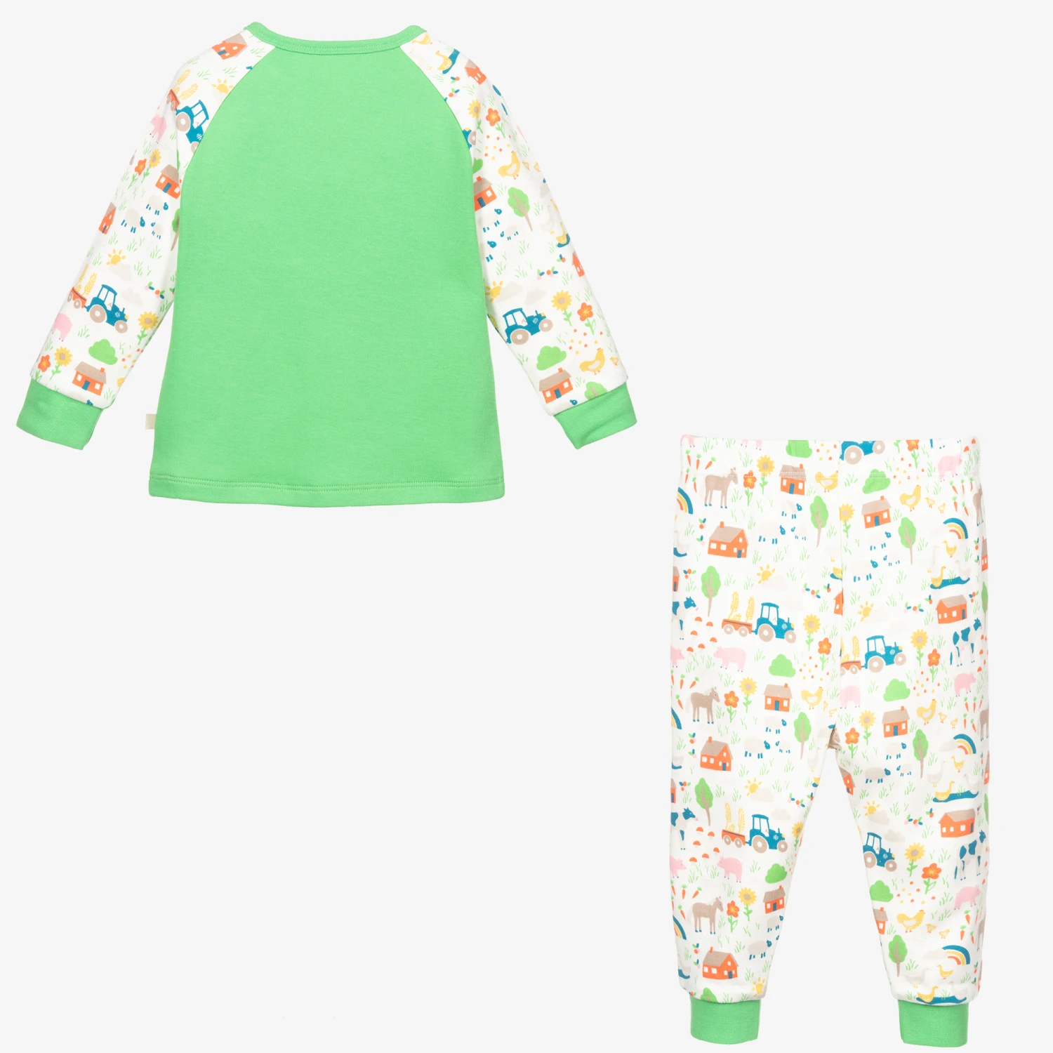 Lovely green and white pyjamas for boys, by Frugi. Made from organic cotton jersey, the top has a sweet tractor appliqué on the front, with poppers on the shoulder for easy dressing. It comes with matching white farm print bottoms with green trims.