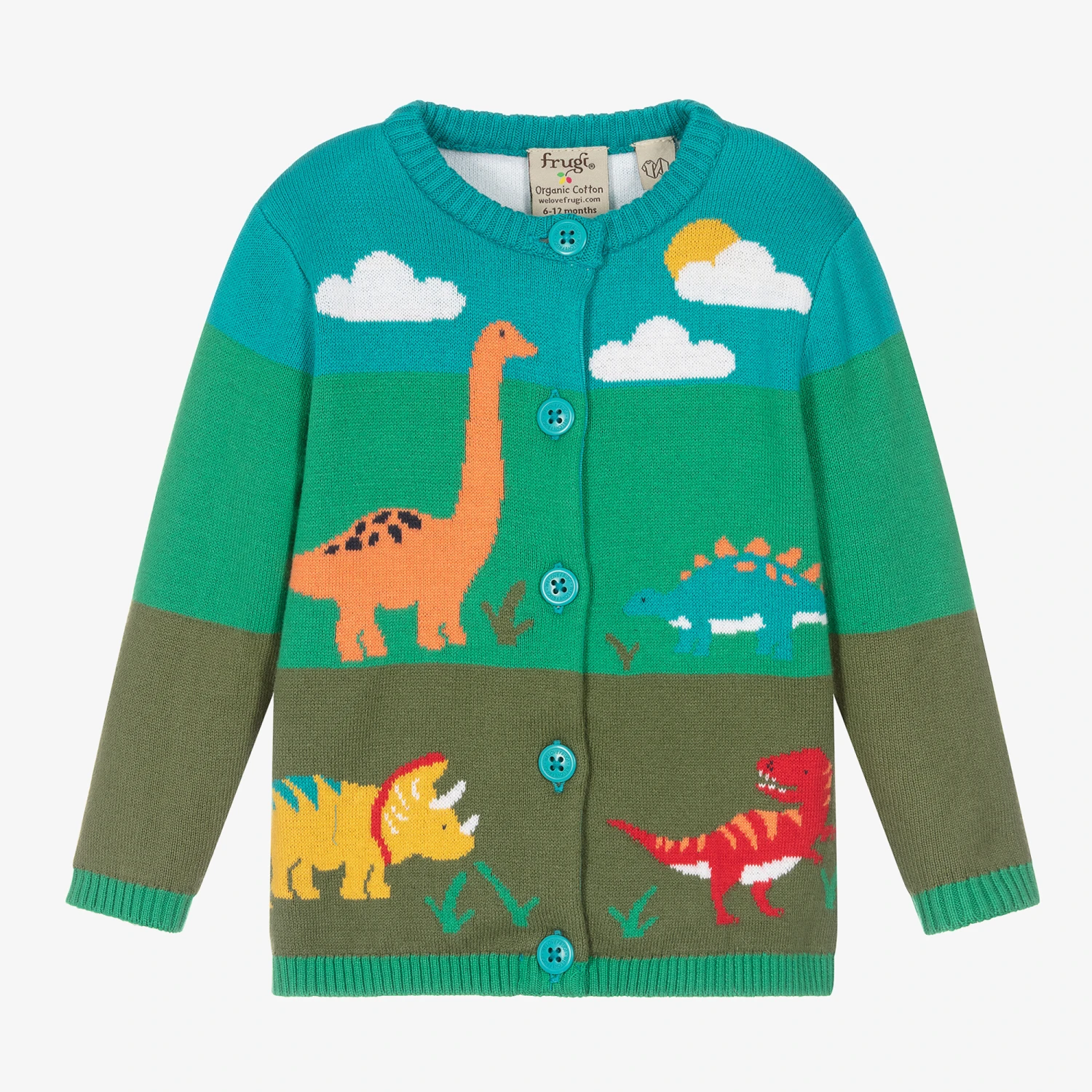 Super cute green and blue cardigan for little boys and girls by British brand Frugi, knitted in soft, mid-weight organic cotton. It has colourful intarsia dinosaurs on the front and a larger dinosaur motif with a colourful rainbow and clouds on the back. Cosy and warm, it has ribbed trims and blue logo buttons on the front.