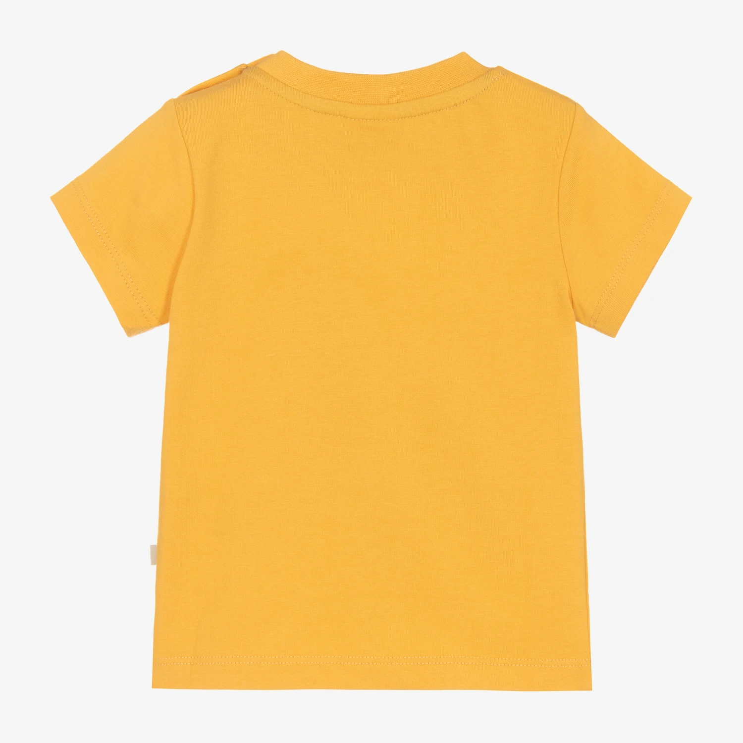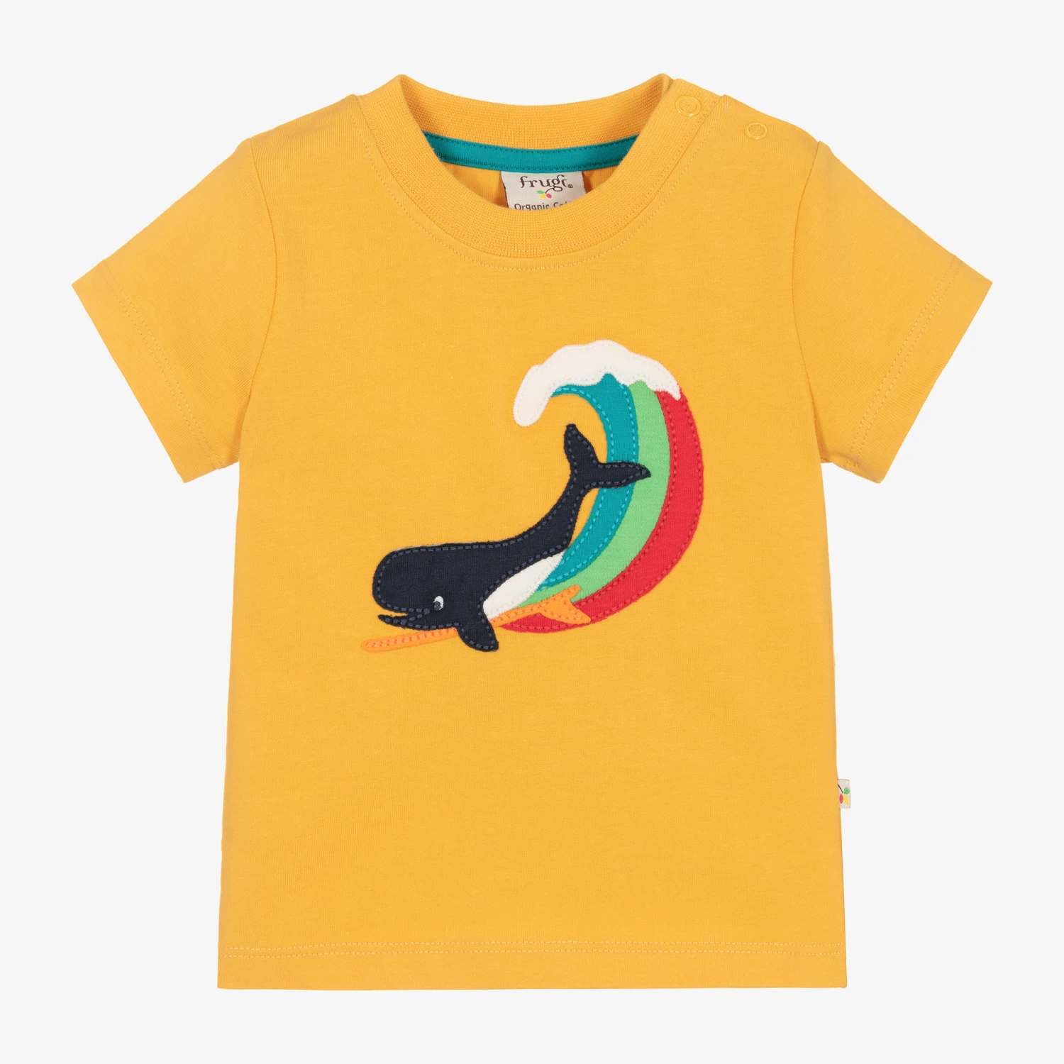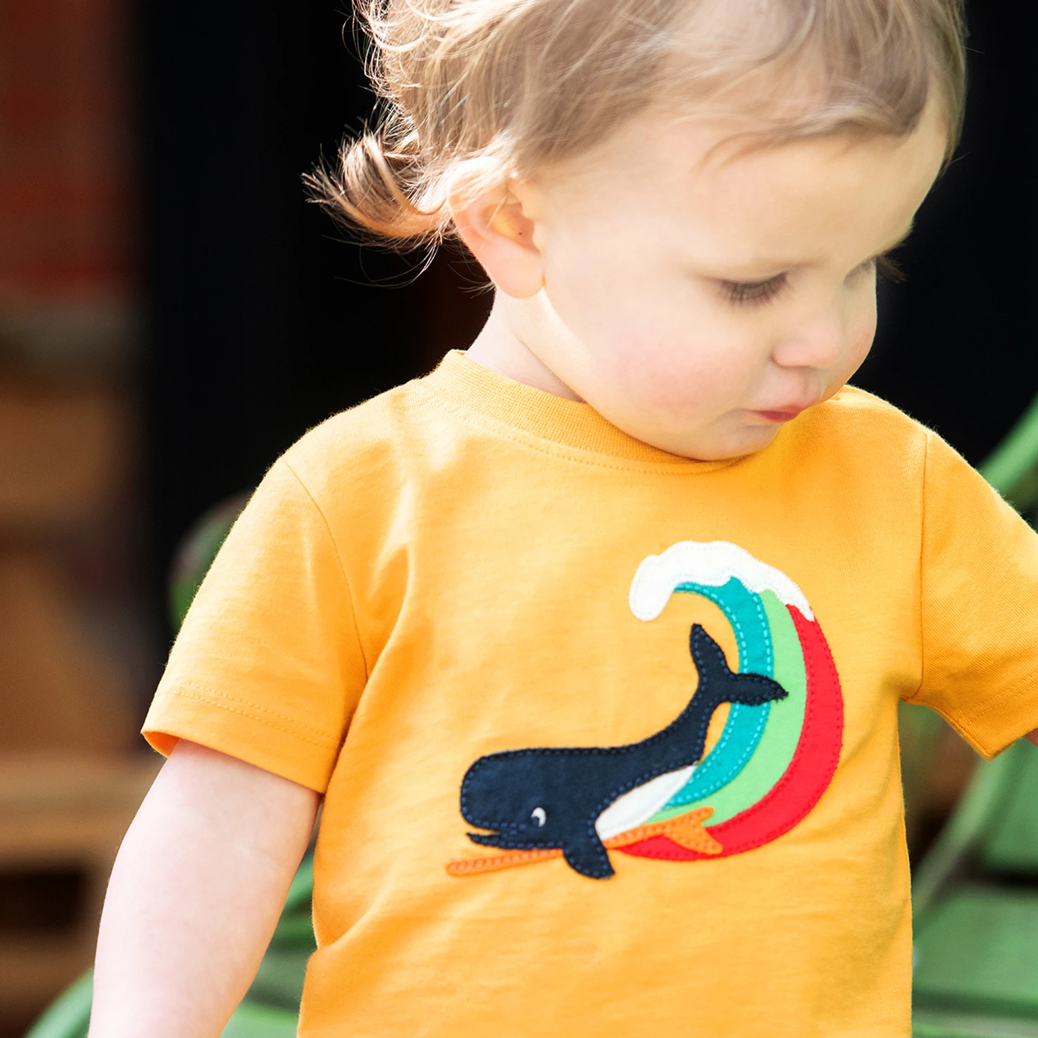 Bright mustard yelllow T-shirt for little boys and girls by British brand Frugi, made in soft and stretchy organic cotton jersey. This fun T-shirt has a cute and colourful appliqué on the front of a whale surfing on a rainbow wave. There are useful popper fastenings on one shoulder to help make dressing easy.