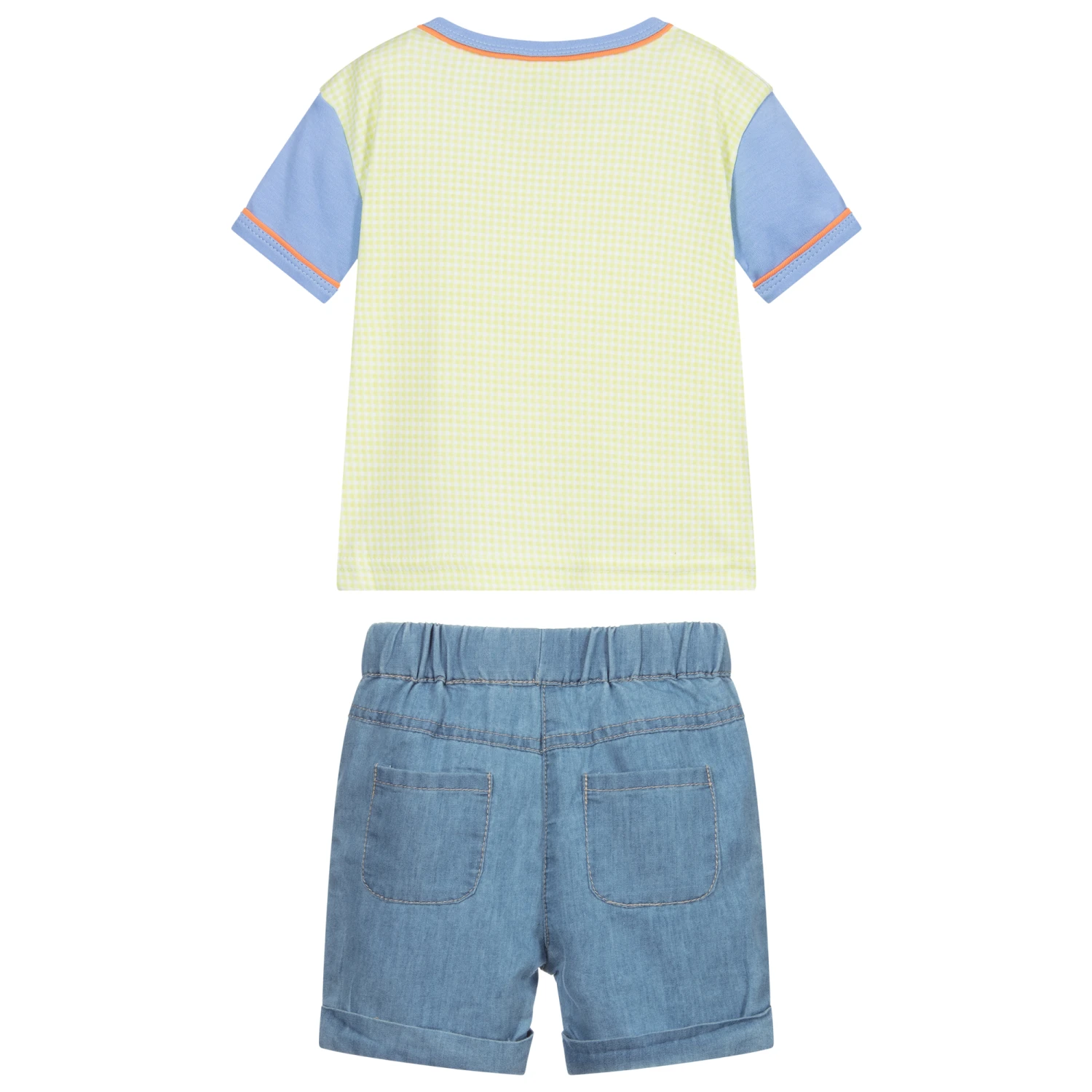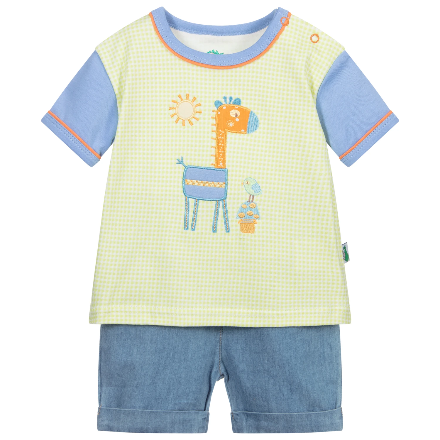 Baby boys shorts set in blue and pale green by FS Baby. The top has a green and white checked pattern, with blue sleeves and trim, and a cute giraffe and bird appliqué on the front. The blue soft cotton chambray shorts have an elasticated waist, with front and back pockets.
