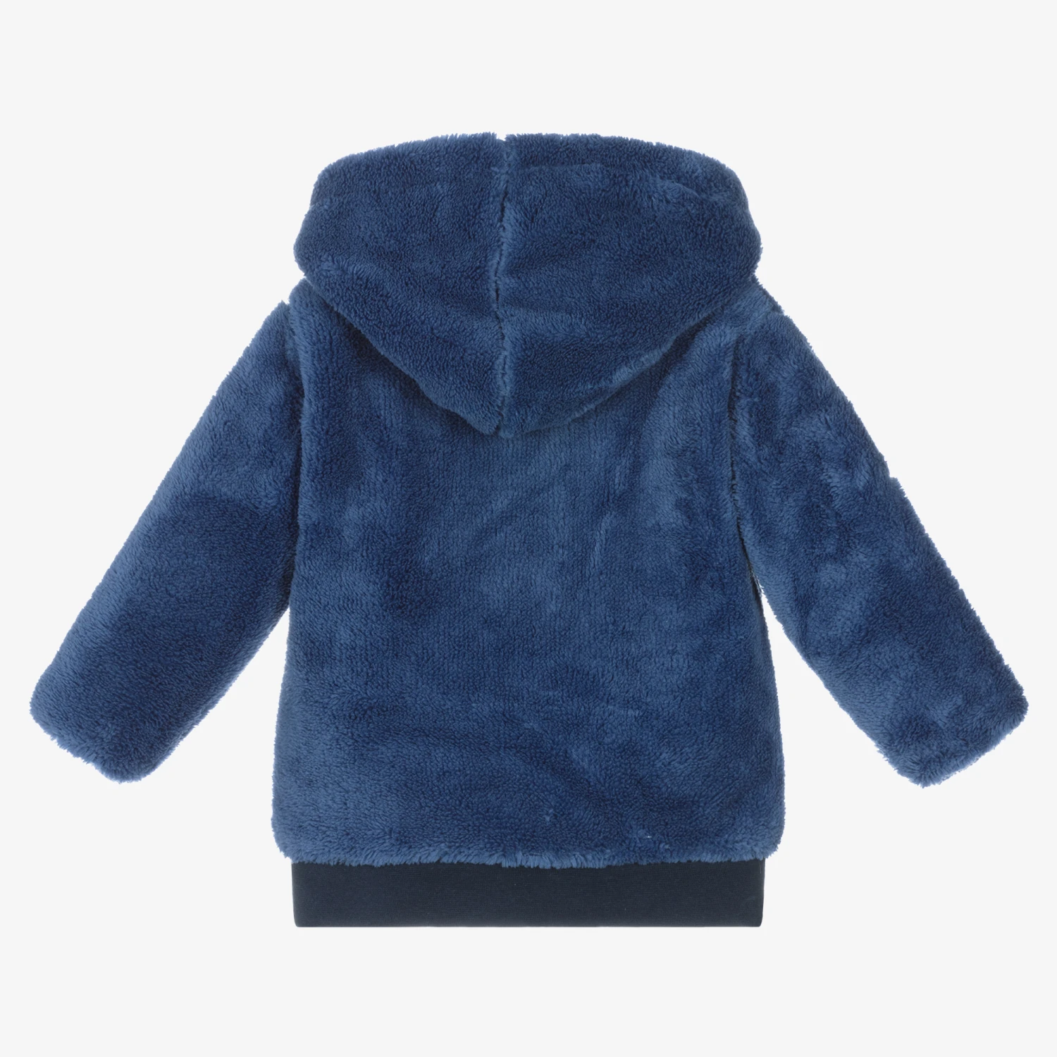 Blue hooded zip-up top for little boys by FS Baby, made in super soft faux fur and lined in comfortable cotton jersey. This cosy hoodie has a sweet dog appliqué on the front, with a matching print on the lining of the hood. The easy-to-use zip fastening at the front has a protective chin guard for safety.