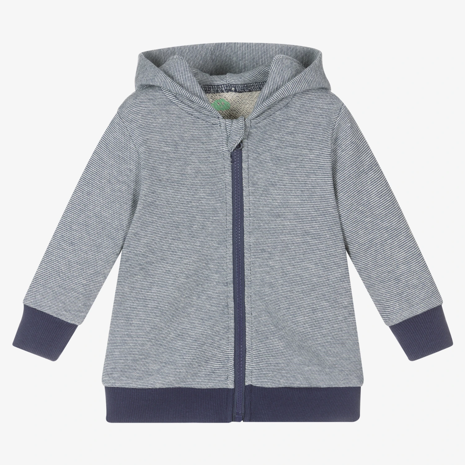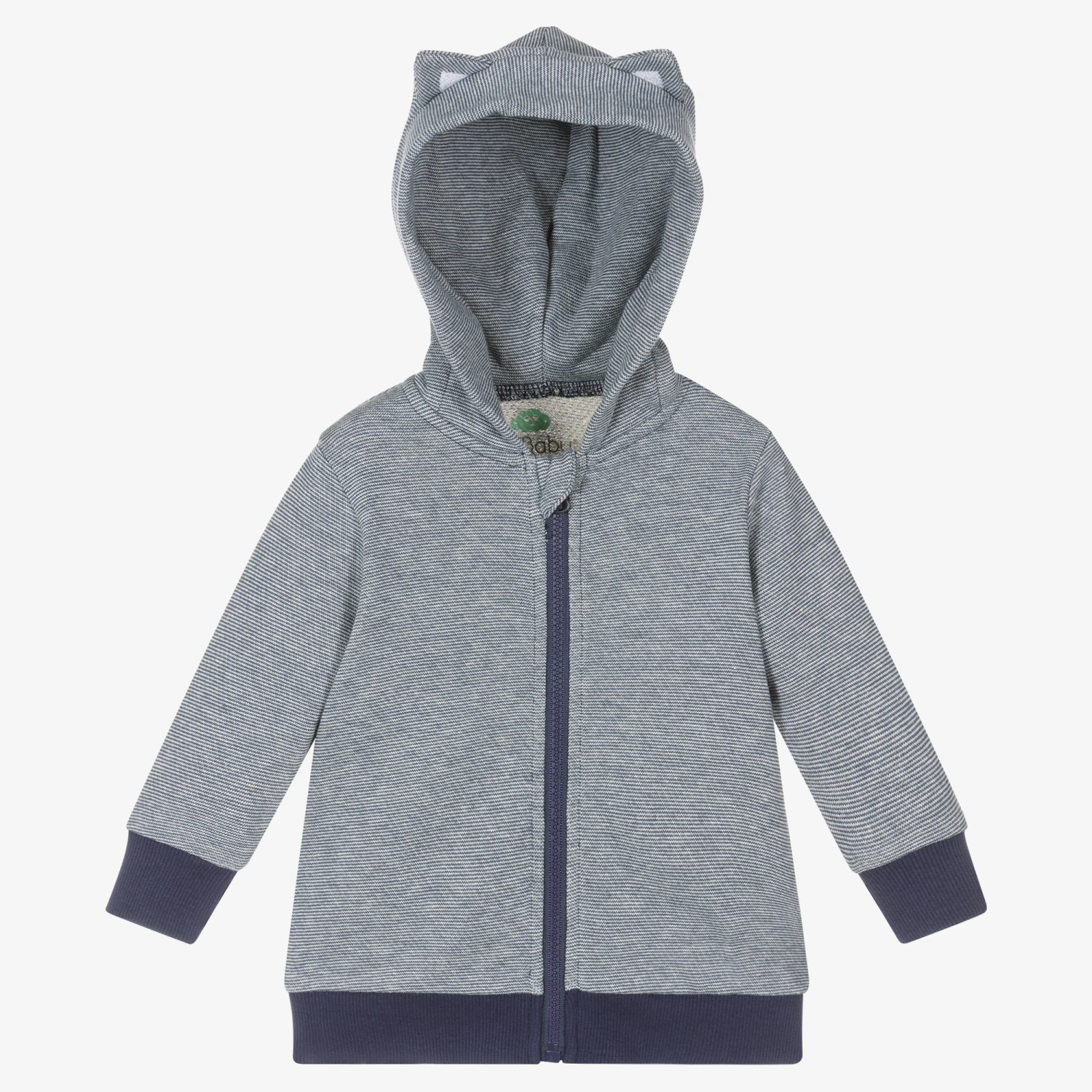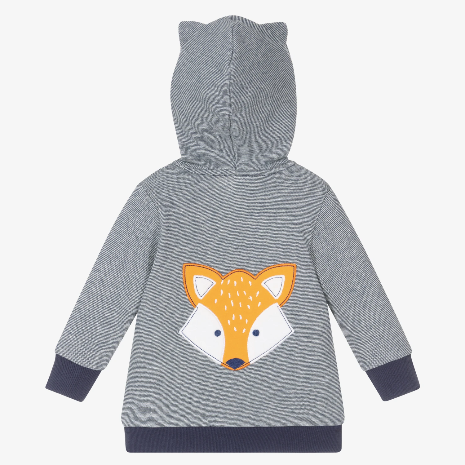 In a fine navy blue and grey Milleraise stripe, this hooded zip-up top for boys is by FS Baby. Made in soft cotton jersey, it has cute 3D ears on the hood and an orange and white fox appliqué on the back.