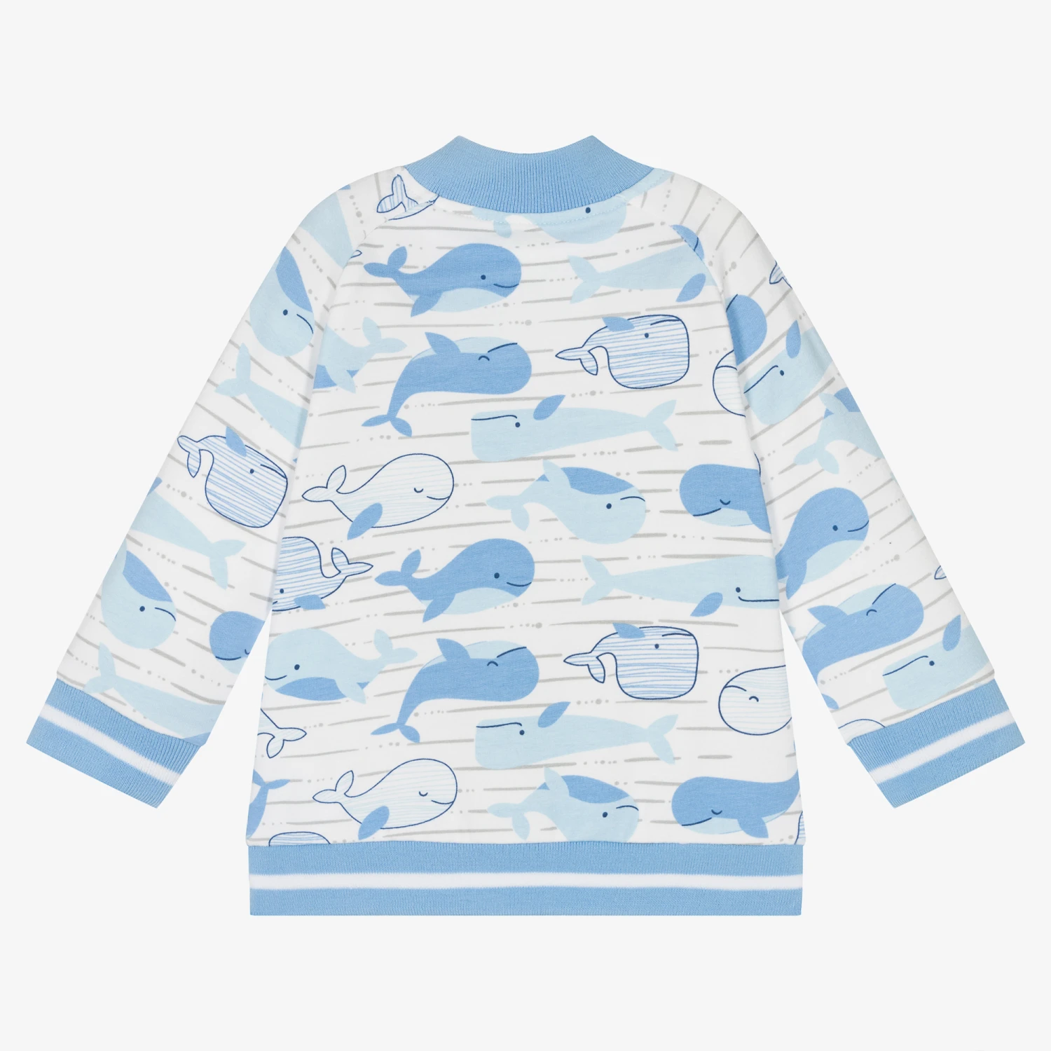 White and blue zip-up top for little boys by FS Baby, made in soft and stretchy cotton jersey. Comfortable to wear, it is patterned with happy, smiling whales and has blue-striped ribbed trims. It fastens at the front with an easy-to-use zip, with a protective chin guard.