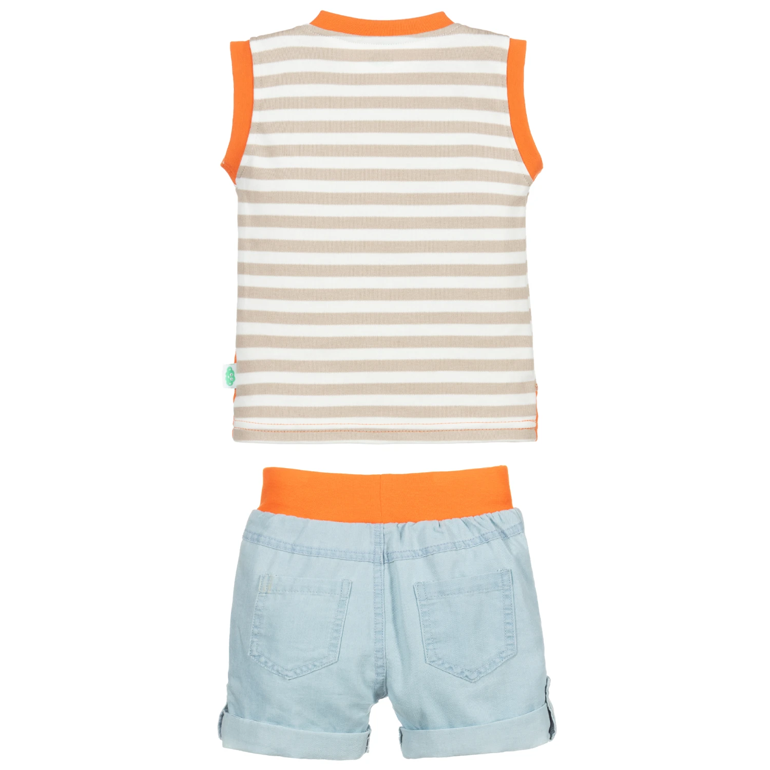 A top and chambray shorts set by FS Baby for little boys, with a cute green crocodile motif. The sleeveless beige and ivory top is made from stretchy cotton jersey, with bright orange trims. The soft blue chambray shorts have a bright orange elasticated waistband. Lightweight, they have front and back pockets, with popper fastening turn-ups.