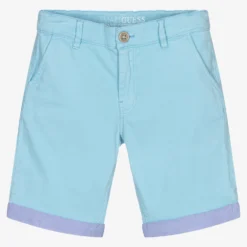 Sky blue shorts for boys by Guess, made in soft organic cotton. They have an adjustable waistband, four pockets, and logo embroidery on the back. The turn up hems are in contrasting blue Oxord cotton.