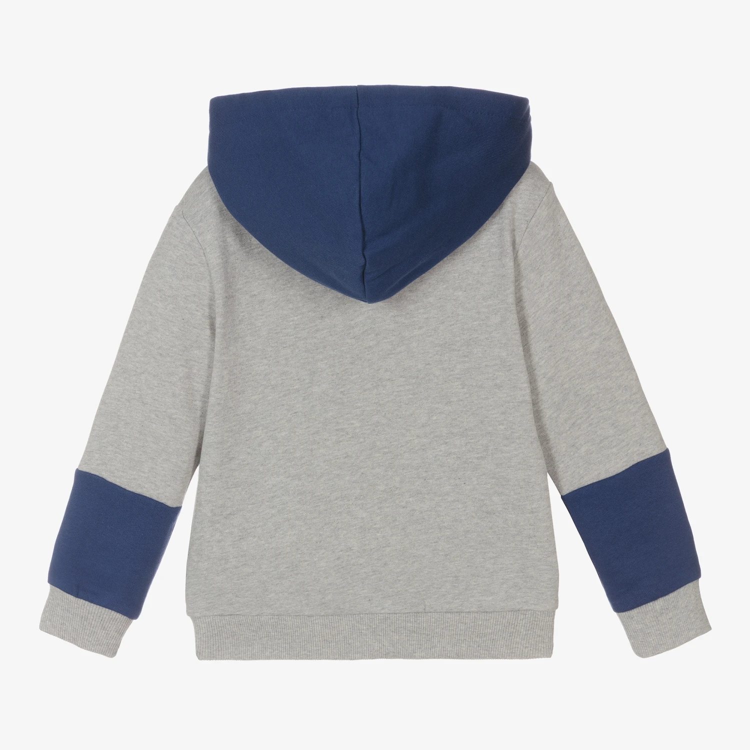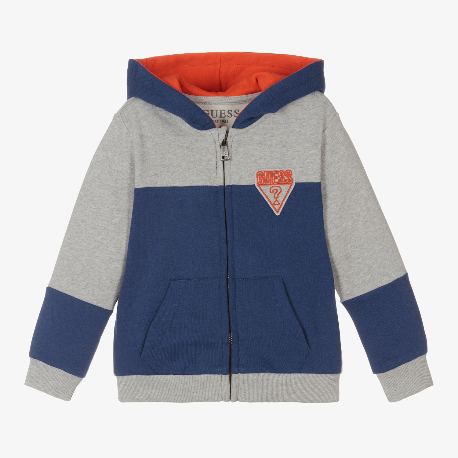 Blue and grey zip-up hoodie for boys by Guess, with an embroidered orange triangle logo on the chest. Cosy and comfy, it is made in soft cotton jersey with a warm fleecy inside. The hood is lined in orange cotton jersey and there are pouch pockets on the front. This product contains in-conversion cotton fibre.