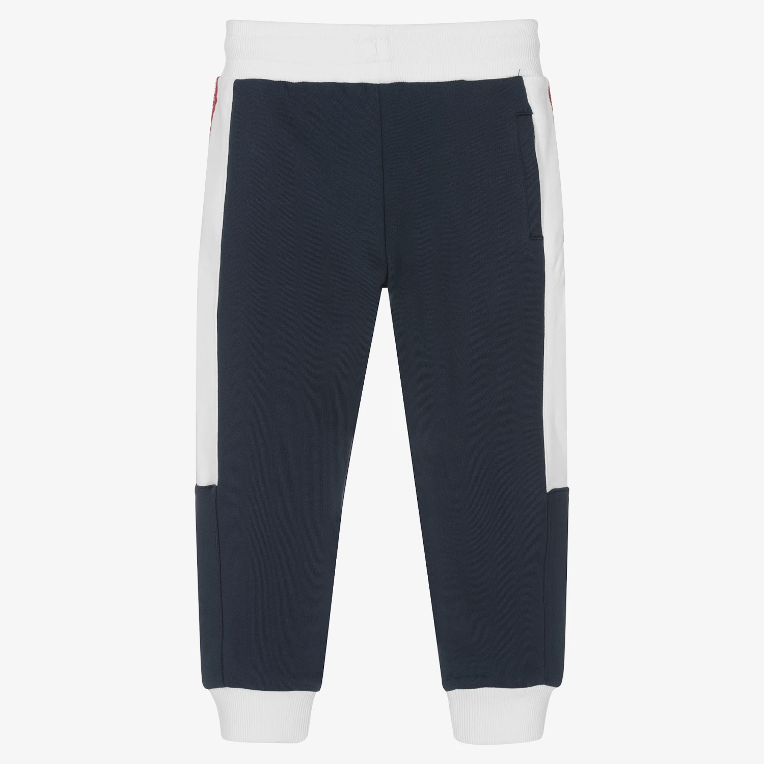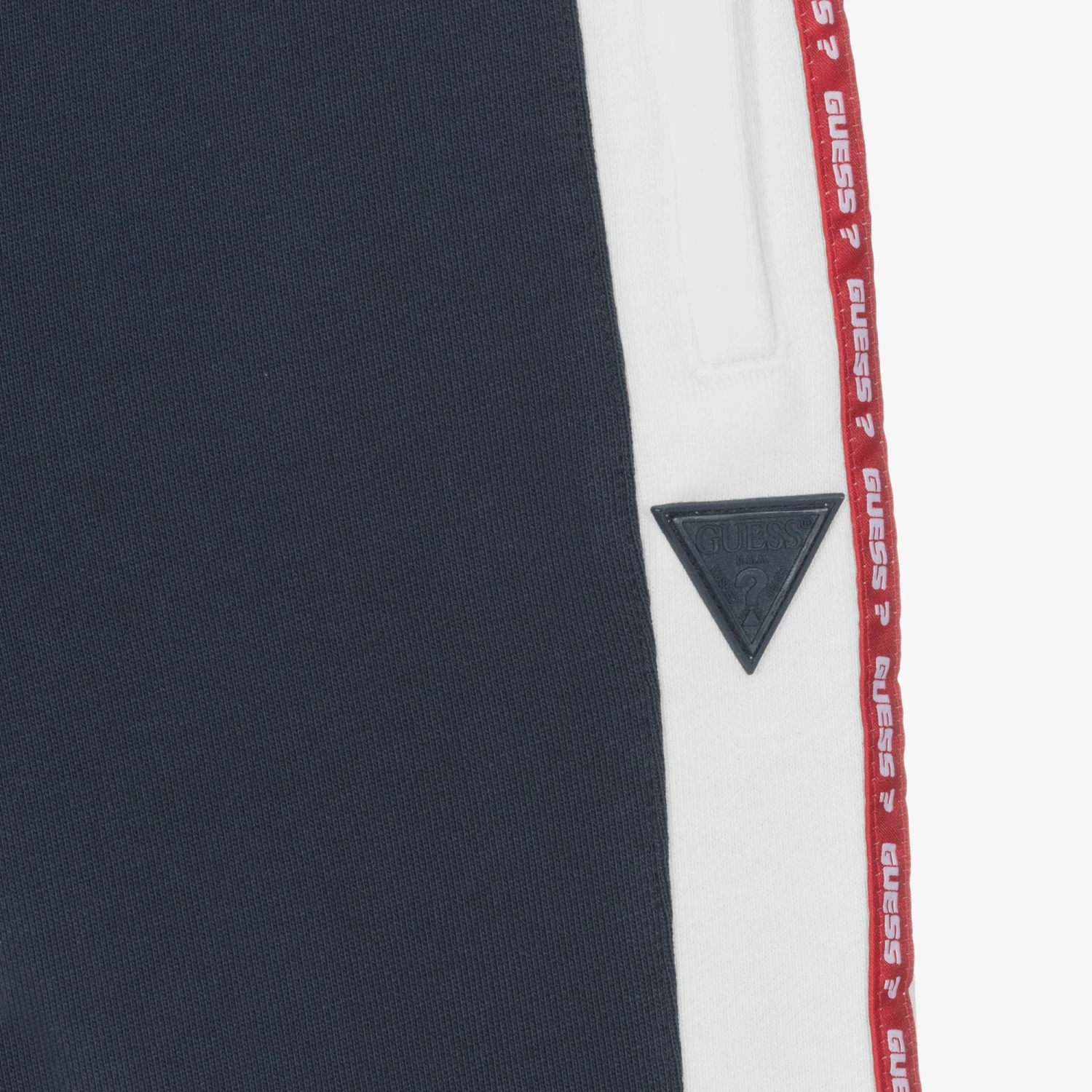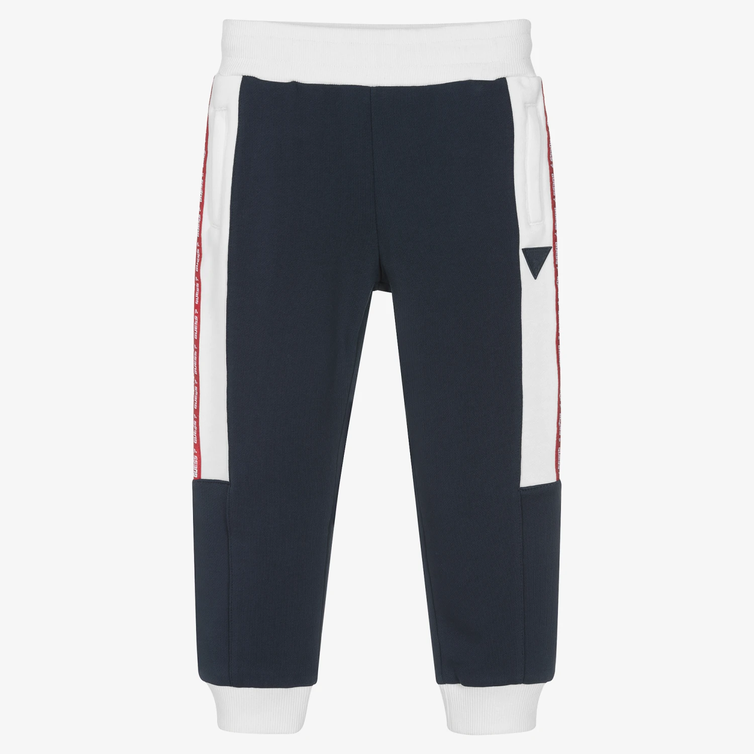 Navy blue and white Mini-me cotton joggers for boys by American brand Guess. Made in soft and mid-weight jersey they have two front and one back invisible zip pockets. They have red logo ribbon down the sides of the legs and a rubberised logo patch for an extra branded touch. For a comfortable fit, they have ribbed ankle cuffs and an inside drawstring on the elasticated waist.