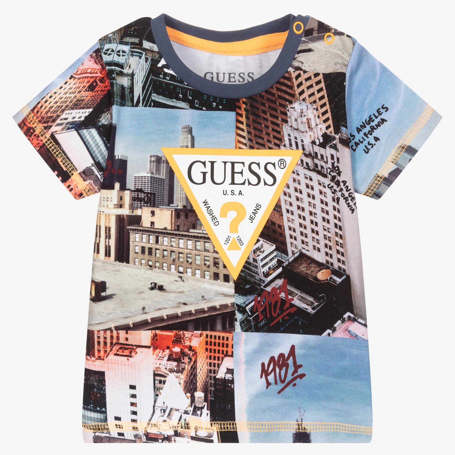 From American brand Guess, a city print T-shirt for boys in shades of blue, grey and beige. Made in soft cotton jersey, it has the brand’s signature Triangle logo print in white, black and neon orange on the front.