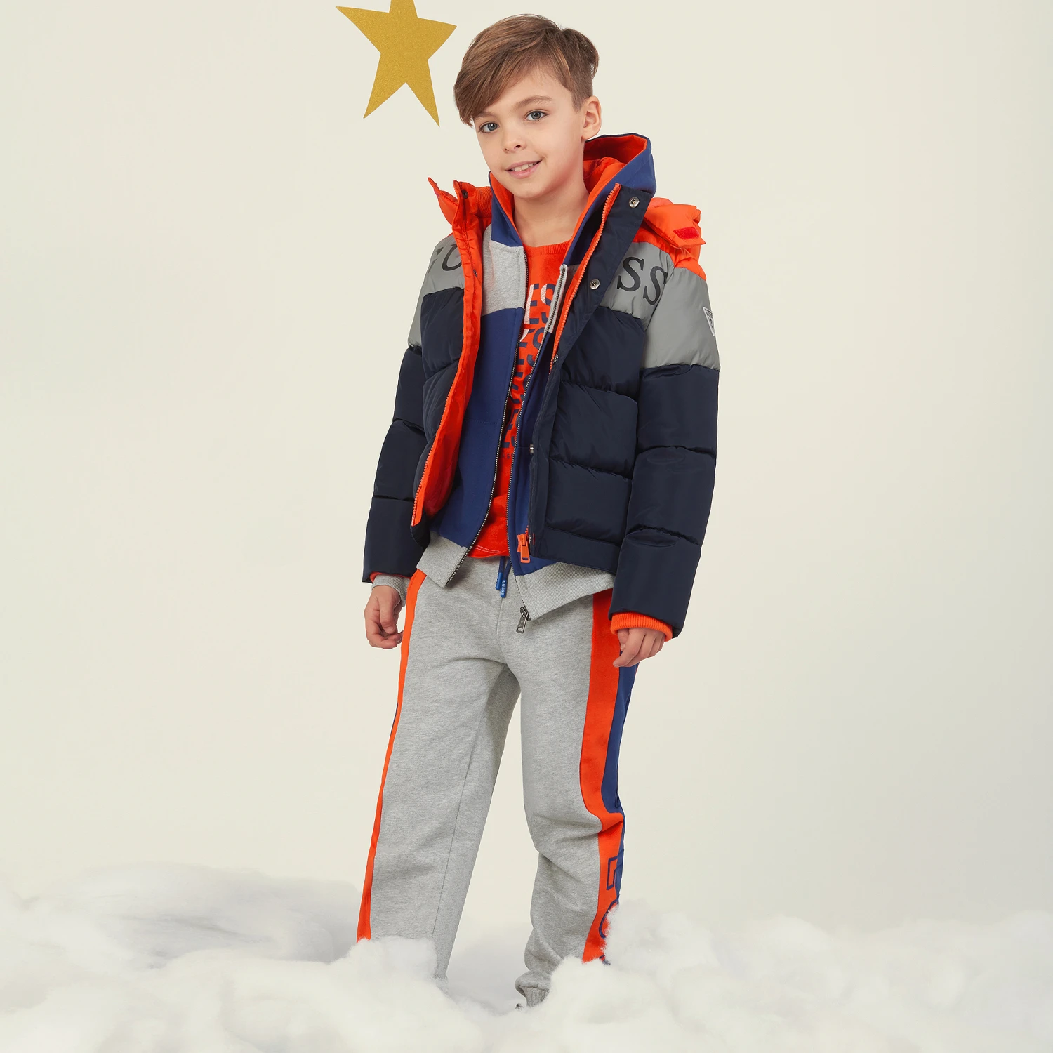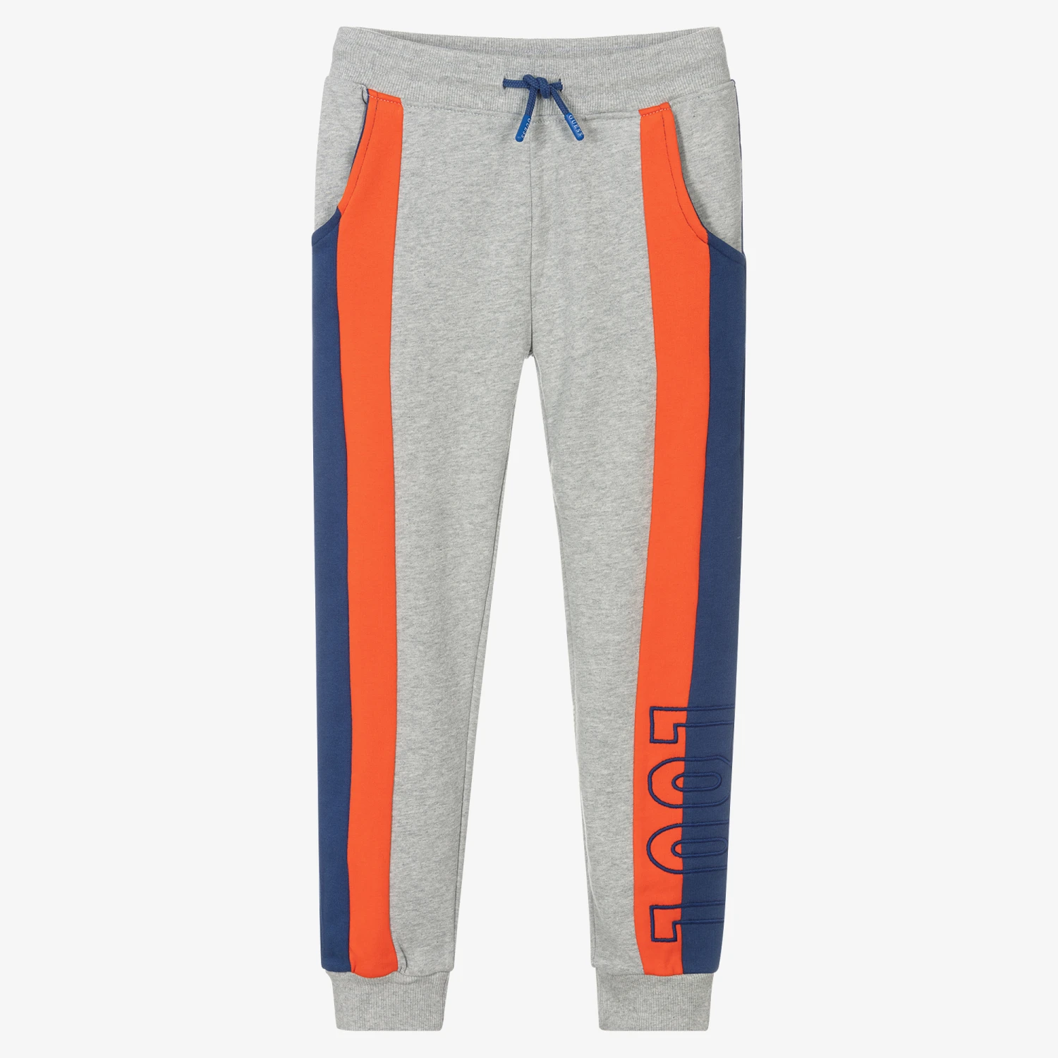 Grey, orange and blue joggers for boys by Guess, with ‘1981’ embroidered on one leg. Cosy and comfy, they are made in soft cotton-blend jersey with a warm fleecy inside. They have an elasticated drawstring waistband and three pockets, with triangle logo embroidery on the back pocket. This product contains in-conversion cotton fibre.