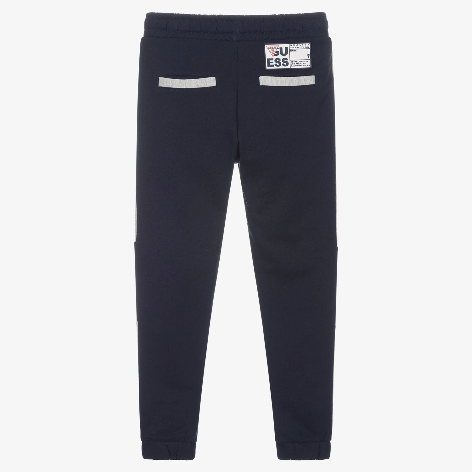 Navy blue cotton joggers for boys by Guess, with a rubberised logo patch on one of the back pockets. Detailed with panels of grey marl, they are made with soft and stretchy sweatshirt jersey for casual wear. There are useful front pockets, green logo tape on the sides and soft ribbed cuffs. There is a drawstring on the elasticated waistband for a comfortable fit.