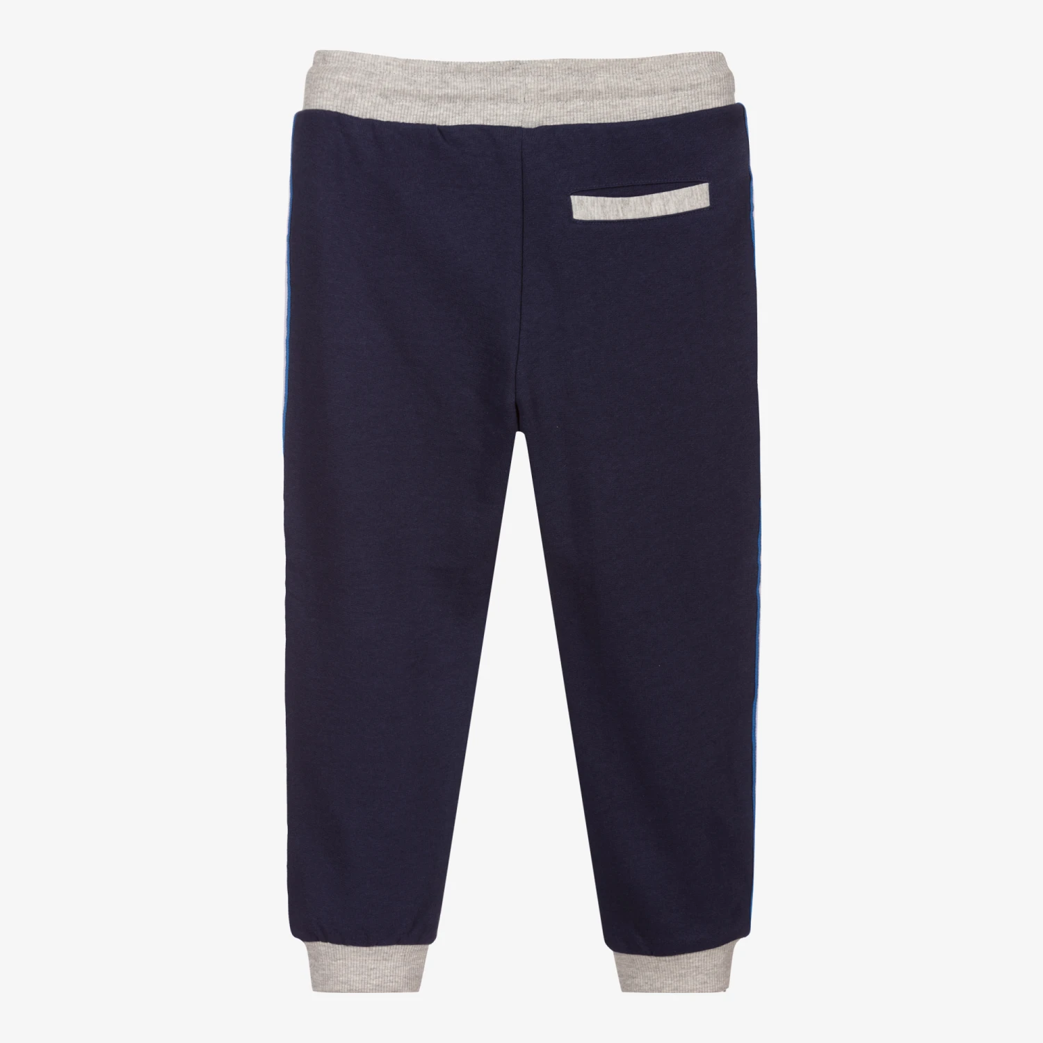 Navy blue joggers for boys, by Guess. Made from soft organic cotton jersey, they have a blue and yellow striped logo trim down the legs, and grey ribbed cuffs.