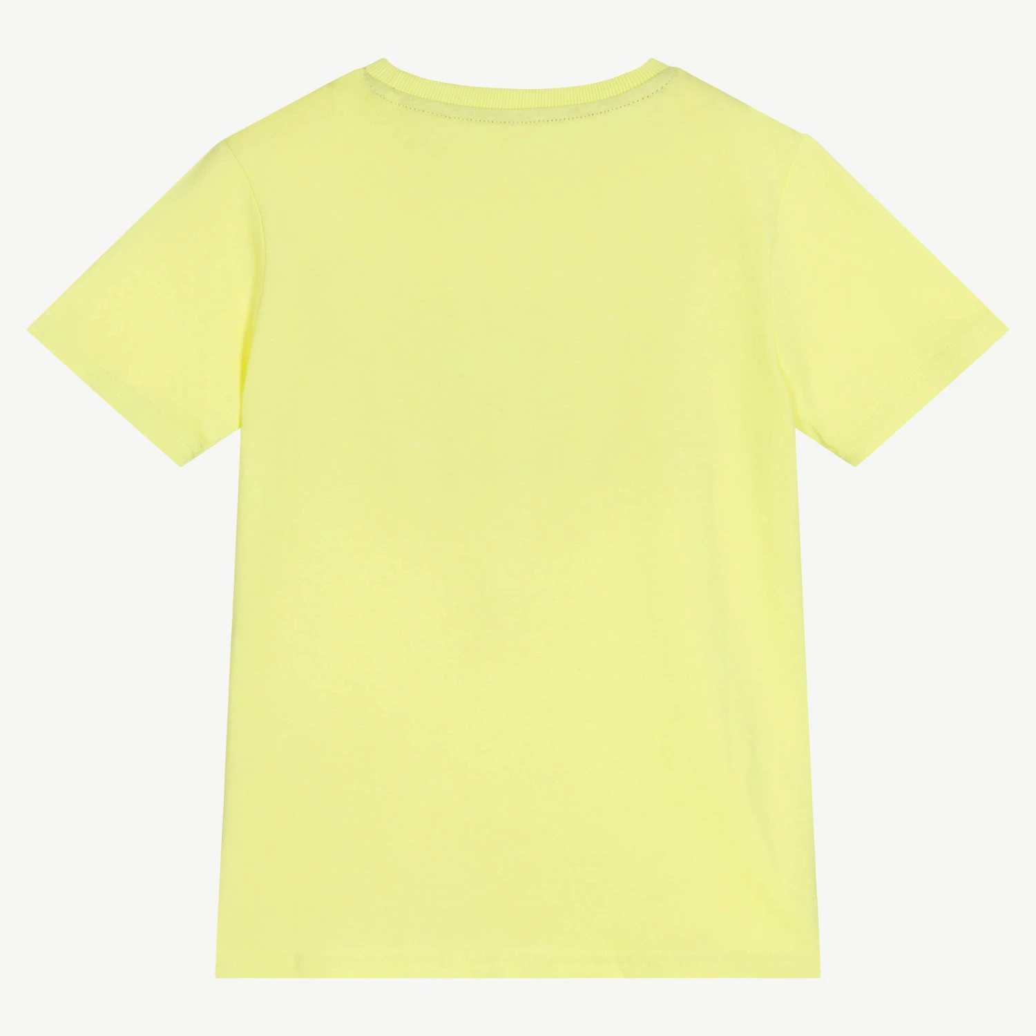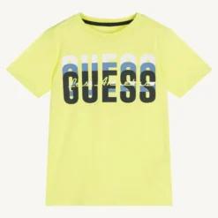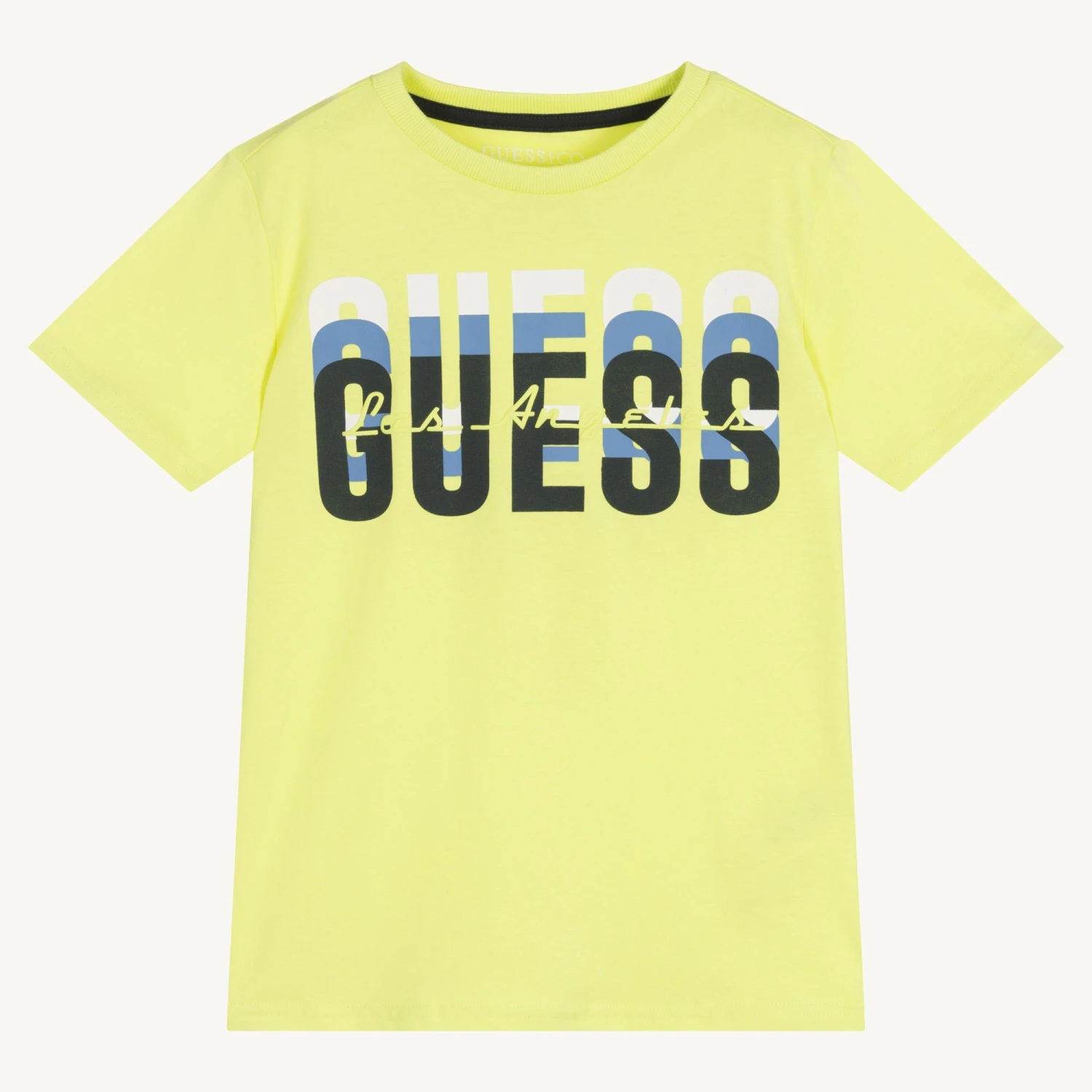Lime green cotton T-shirt for junior boys by American brand Guess, made in all-day comfortable jersey. It has the designer’s bold repeat logo on the front, in white, blue and black. This T-shirt contains organic cotton fibre.