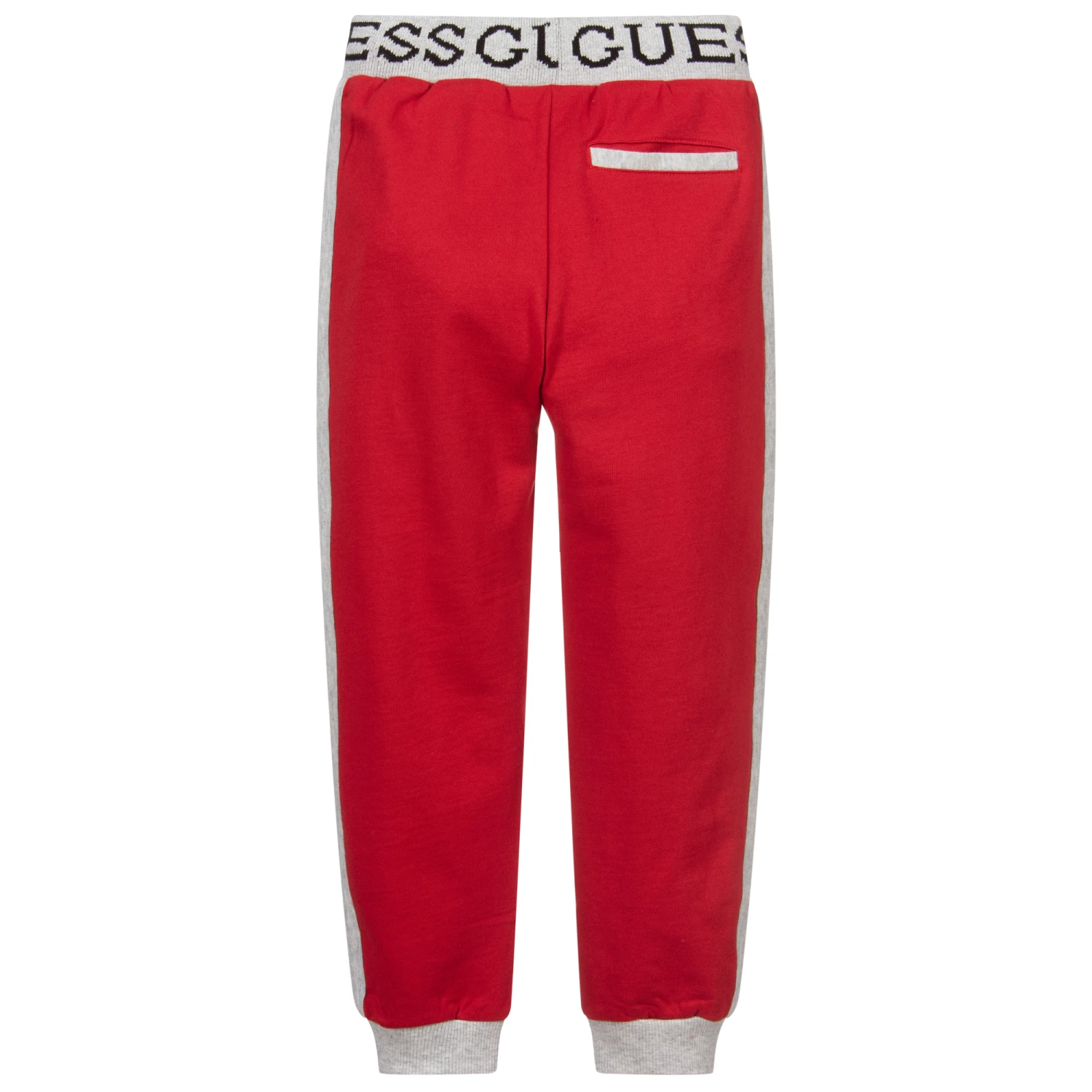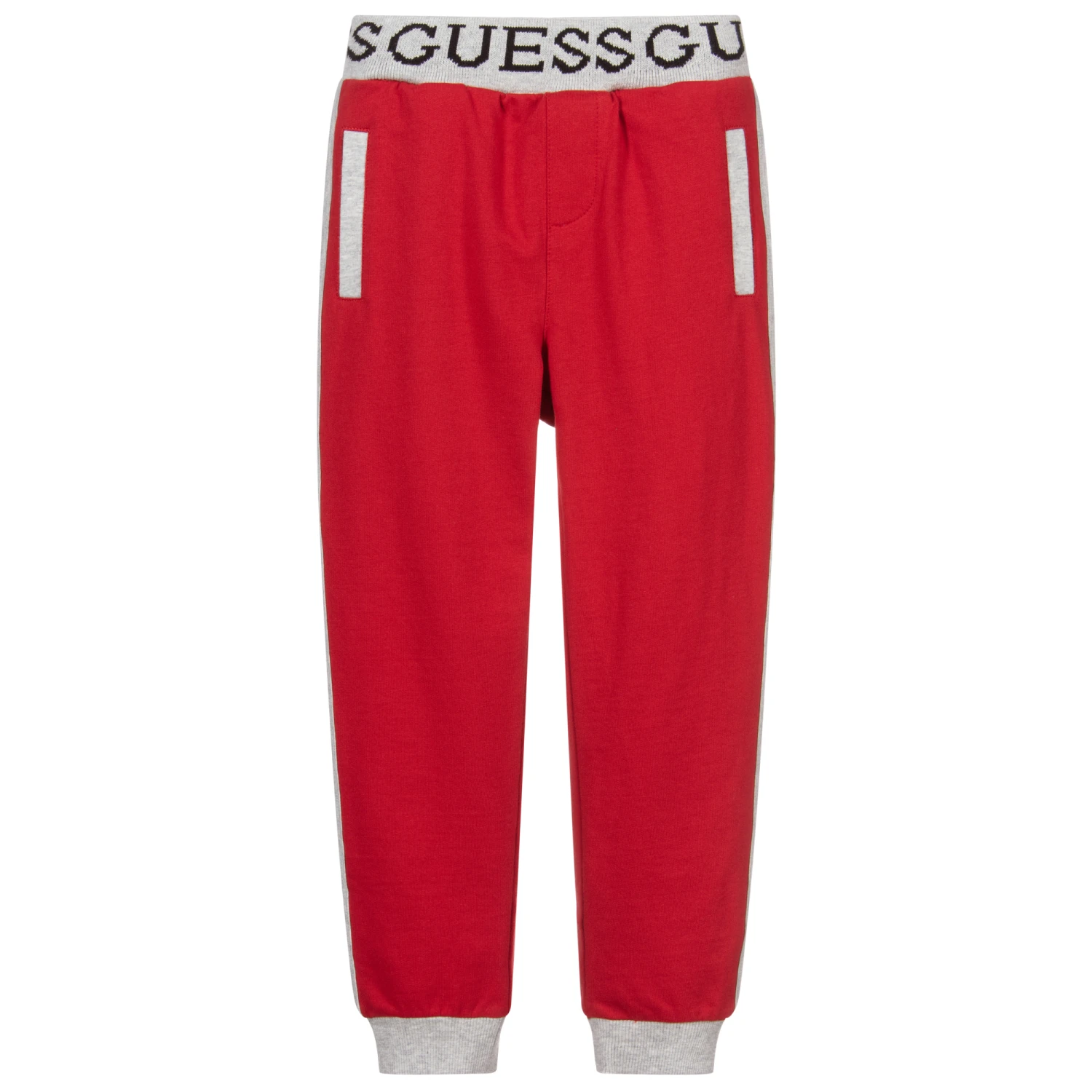 Red joggers for younger boys by Guess, made in soft and stretchy cotton sweatshirt jersey. There are grey trims on the side seams, cuffs and pocket slips, three pockets and black logo branding on the elasticated waistband.