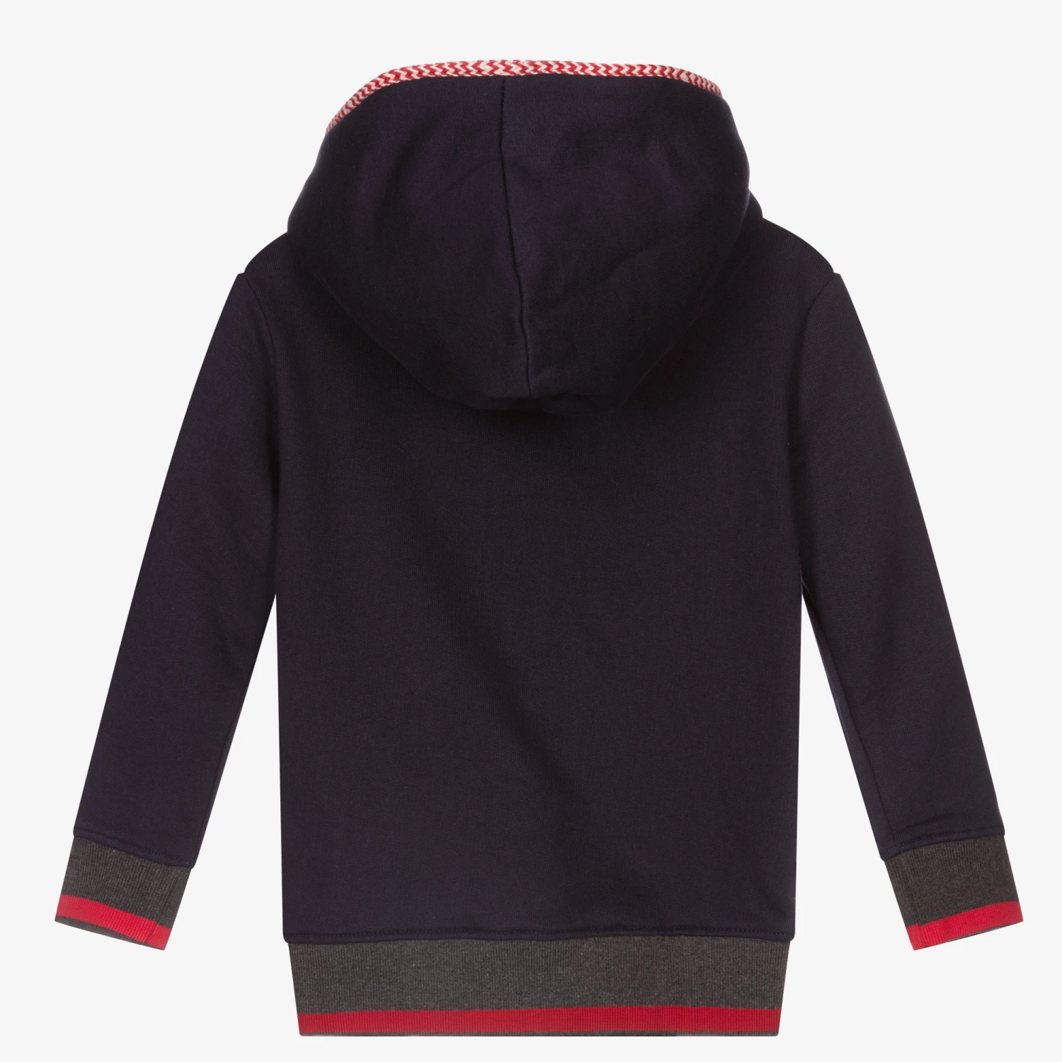 Navy blue, hooded zip-up top for boys by Hatley, made in soft cotton sweatshirt jersey. It has a red embroidered moose on the front and a cosy sherpa fleece lining inside the hood, with red and white zigzag edging. The front pouch pockets and grey ribbed cuffs and hem have red trim.