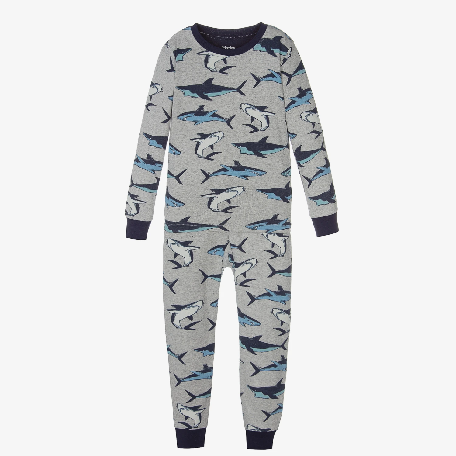 Fun grey and blue pyjamas for boys by Hatley, made in soft organic cotton jersey. These comfortable pyjamas have a cartoon shark print and the snug fit means they are ideal for bedtime or lounging in.