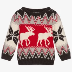 Little boys grey, red and white Fair Isle knit sweater by Hatley. It has a pattern that consists of snowflakes and moose, with charcoal grey trims.