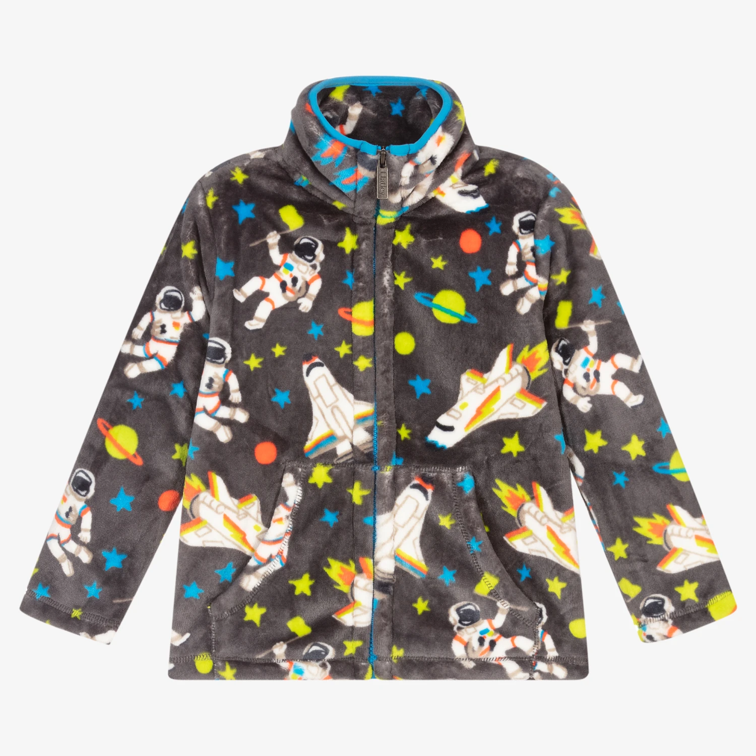 Fun grey zip-up fleece for boys, by Hatley. Made in super soft and cosy plush, this comfortable top has a vibrant outer space pattern, and front pockets.