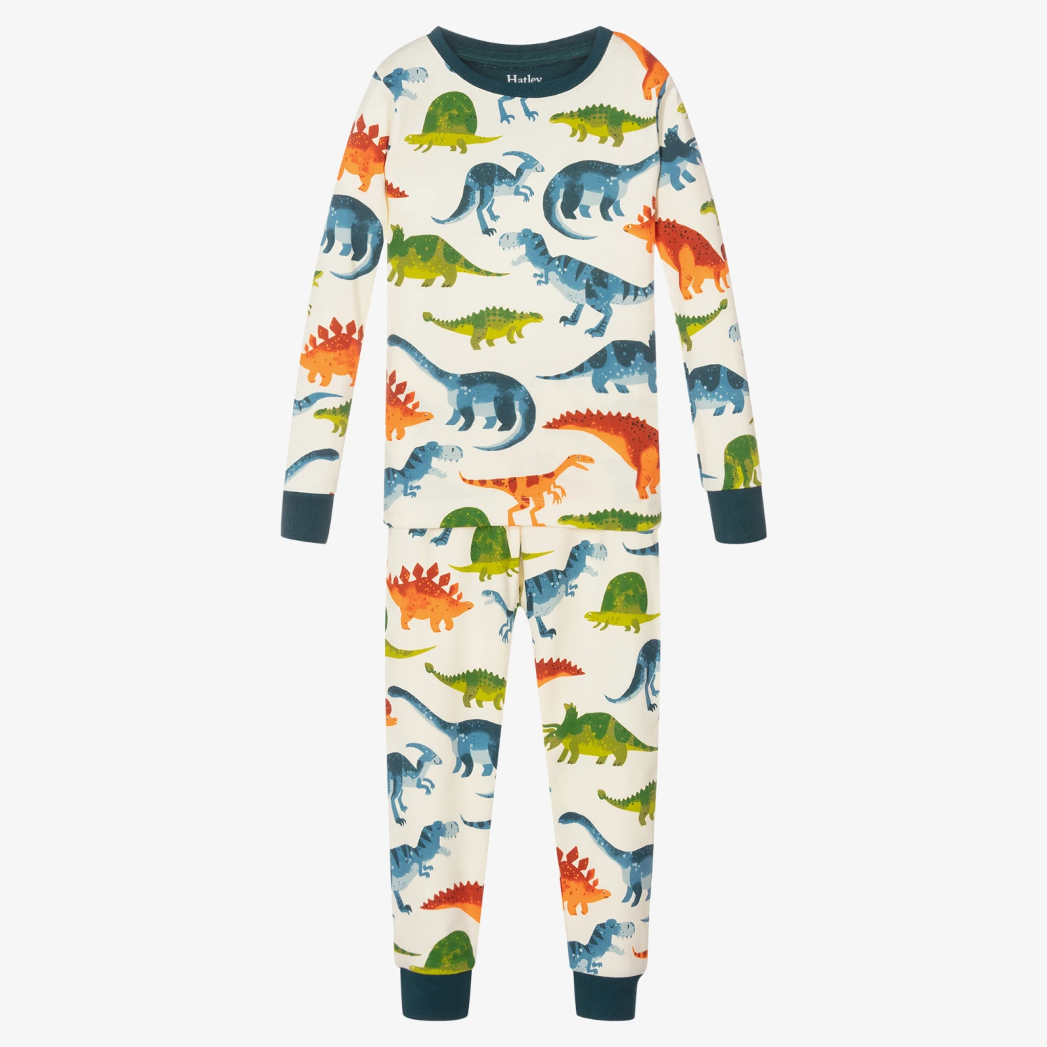 Lovely ivory long pyjamas for boys by Hatley, made in organic cotton jersey and designed to fit snugly. They have teal blue trims and a fun dinosaur print in shades of blue, green and orange, with logo embroidery on the back of the neckline.