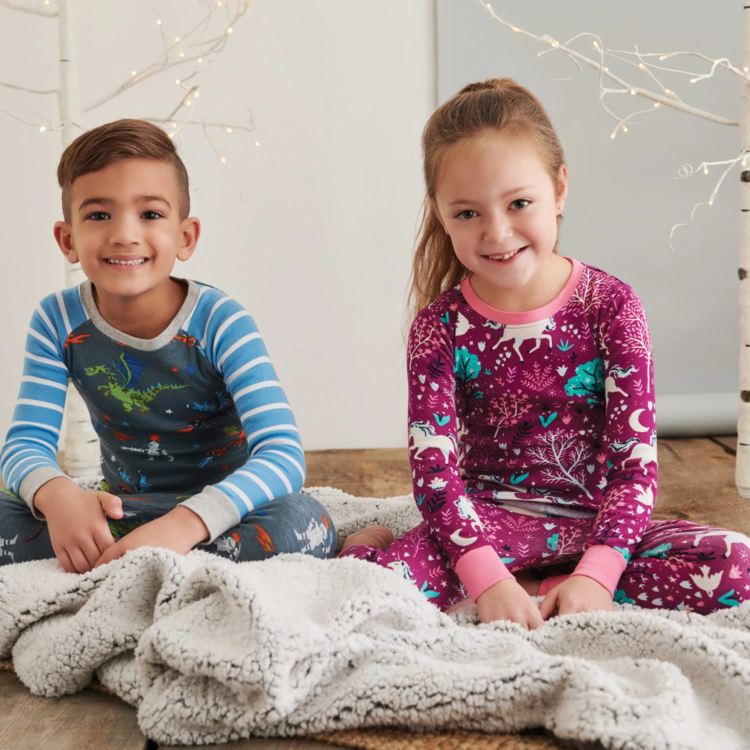Grey pyjamas for boys by Hatley, with a fun knights and dragons print. Snug-fitting, they are made in comfortable, organic cotton jersey, with white and blue striped raglan sleeves and pale grey cuffs. The brand’s logo is embroidered on the back of the top in pale blue.