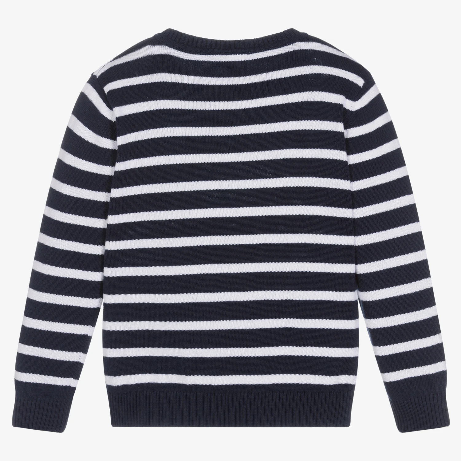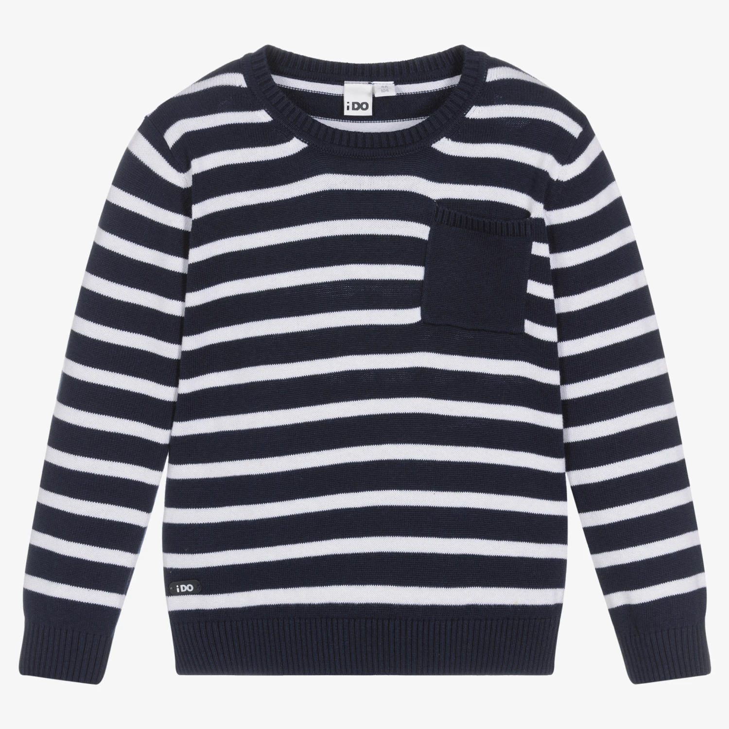 Navy blue and white cotton sweater for boys and girls by Italian brand iDO Baby, with Breton stripes. Ideal for casual, relaxed days, it is soft and lightweight, with a useful chest pocket and neat ribbed trims. The brand’s rubberised logo tab is by the hemline.