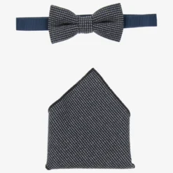 Navy blue and grey bow tie and pocket square set for boys, by iDO Baby. Made from soft knitted polyester, the bow tie has a useful velcro fastening.