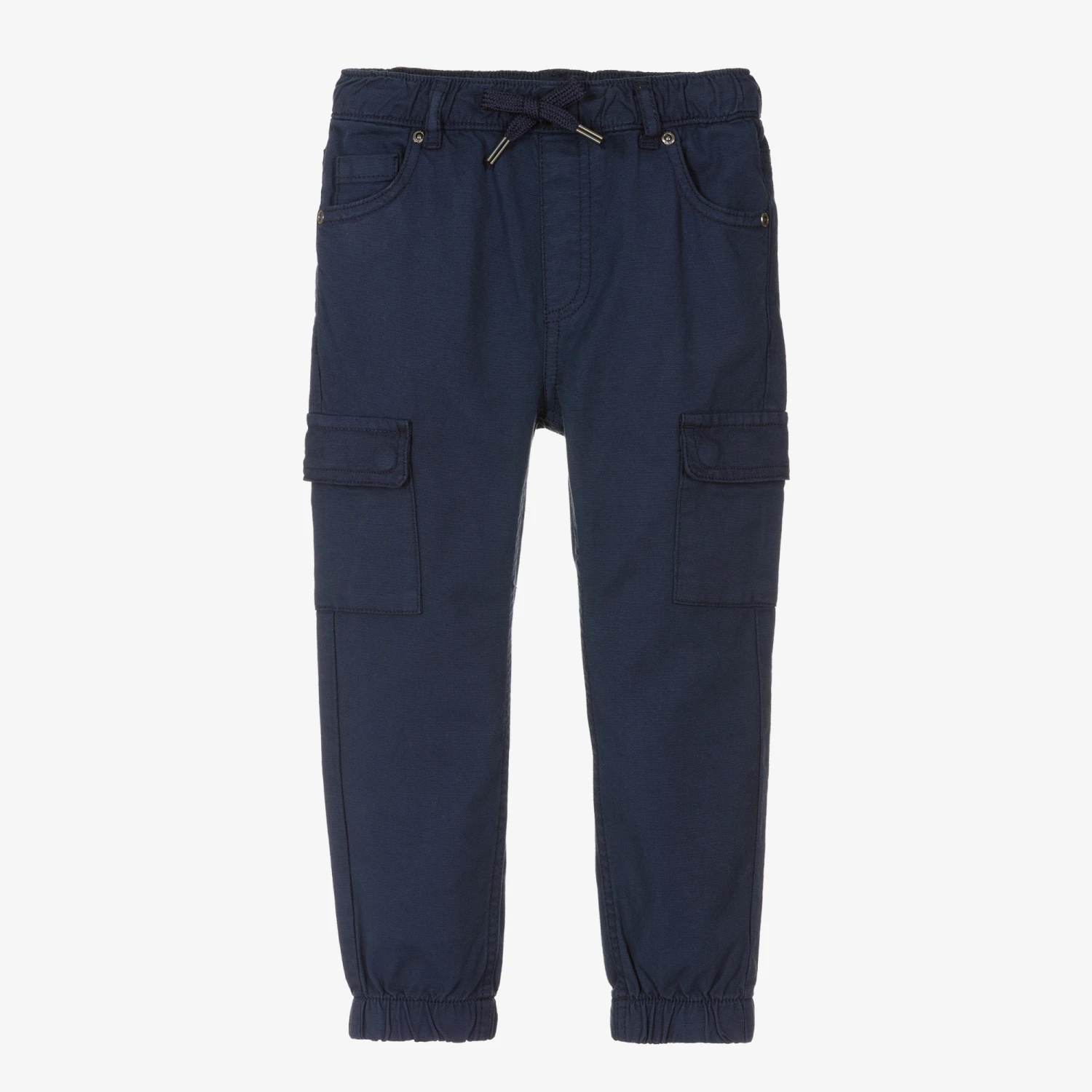 Navy blue jogger style trousers for boys by iDO Baby, woven in soft cotton canvas. Easy and comfy to wear, they have drawstring waist and ankle cuffs that are elasticated. There are cargo pockets on the legs, with a branded jacron patch on the back for a designer finish.