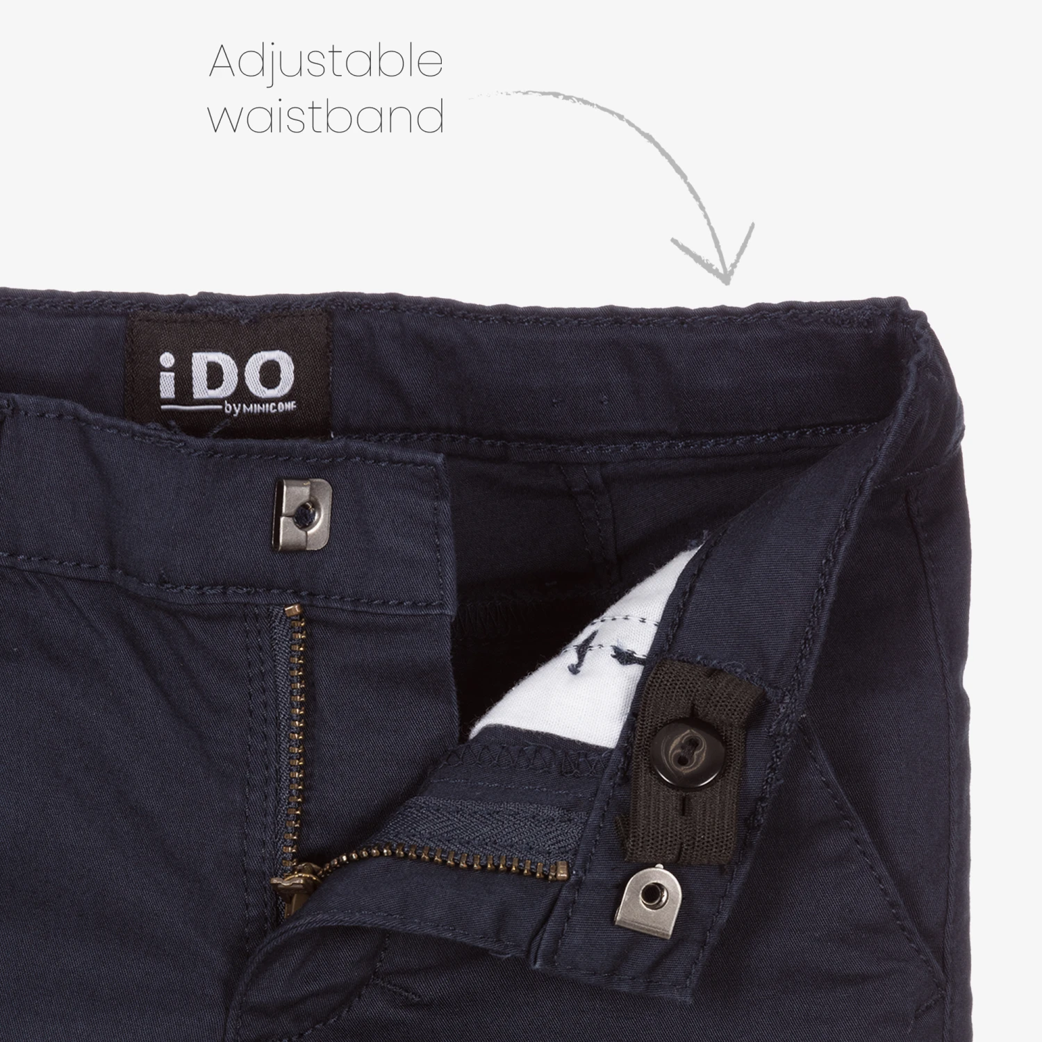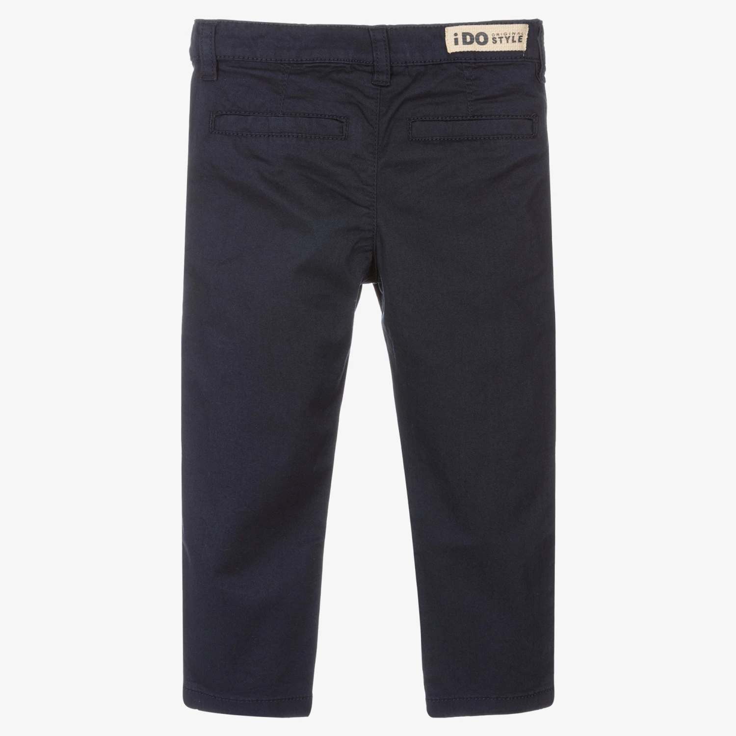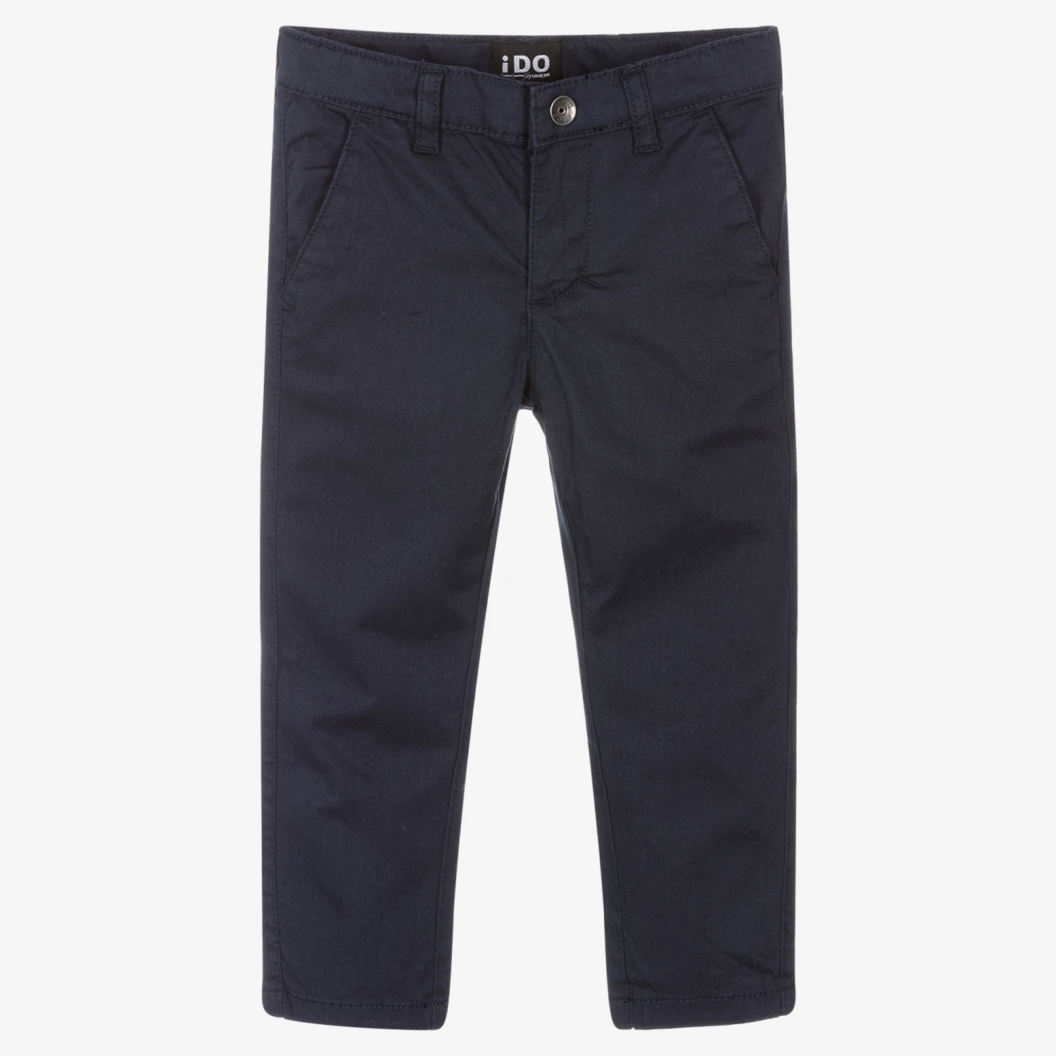 Navy blue slim-fit chino trousers for boys by iDO Baby, made in soft cotton. They have an adjustable waistband, four pockets, and fasten with a zip, hook and eye.