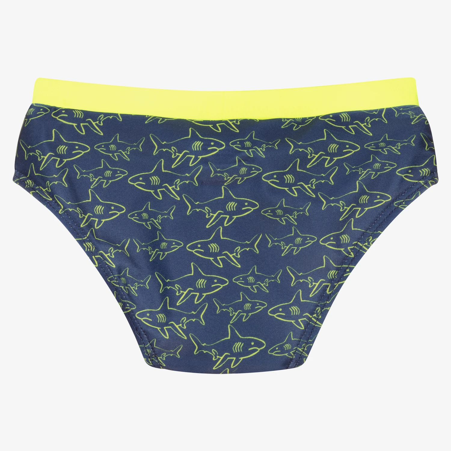 Navy blue swim trunks for boys by iDO Baby, with a neon yellow shark pattern. Silky soft and stretchy, it has a neon yellow elasticated waistband.