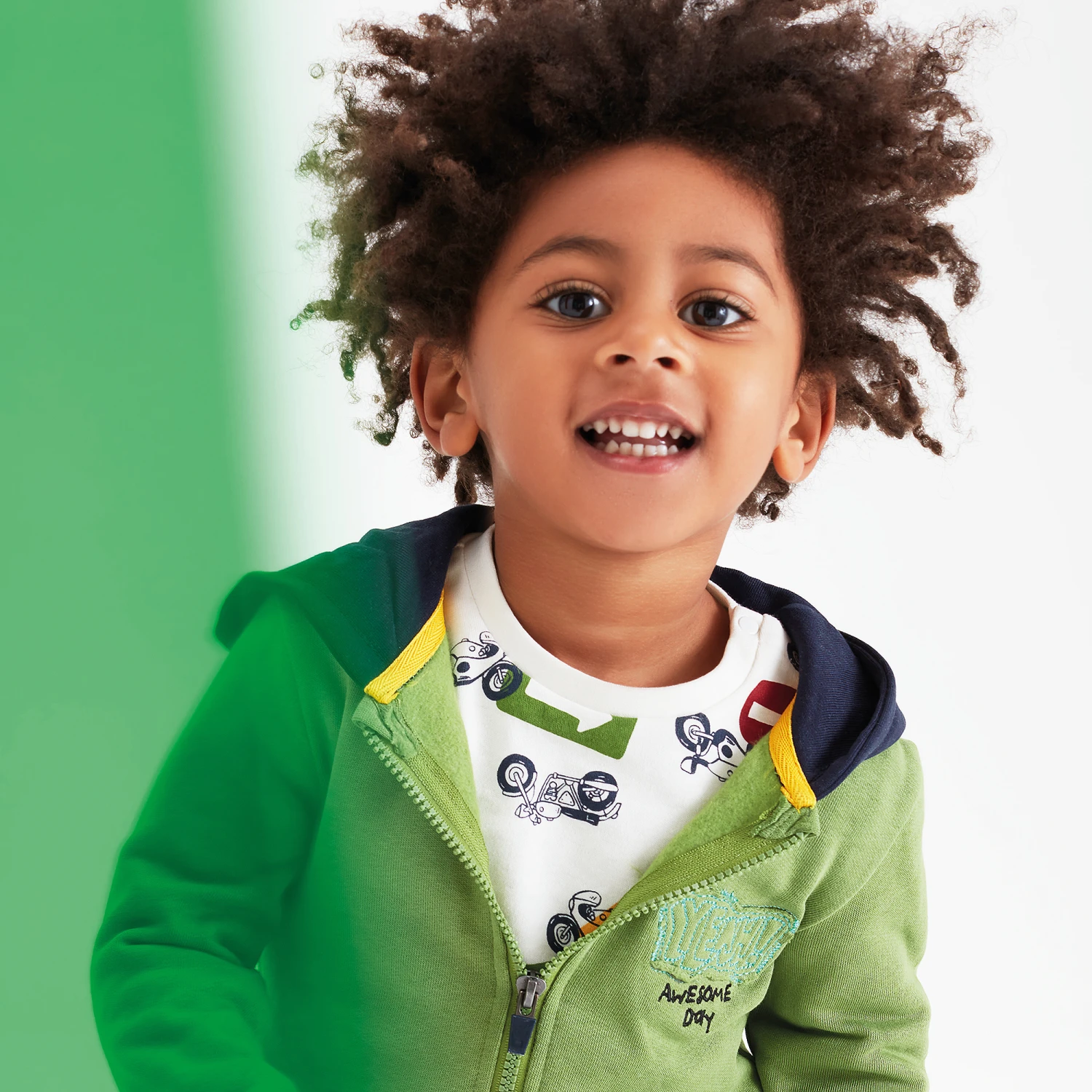 Ivory long-sleeved top for boys by iDO Baby, made in soft cotton jersey. With popper fastenings on one shoulder on smaller sizes, this fun top has an all-over print consisting of red, blue and green road signs, with navy blue motorcycles.