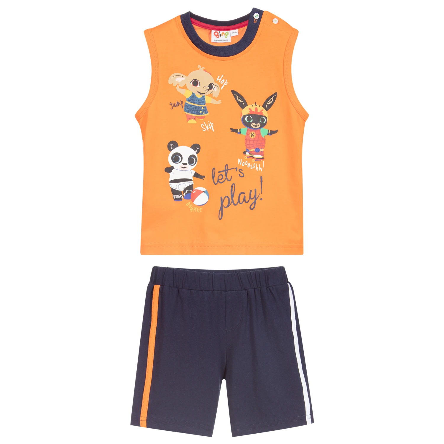 An orange and navy blue sleeveless T-shirt and shorts set for boys by iDO Baby. Made in soft stretchy cotton jersey, the T-shirt has button fastenings on one shoulder and a cute Bing Bunny cartoon character and friends print. The navy blue jersey shorts have a comfortable elasticated waistband.