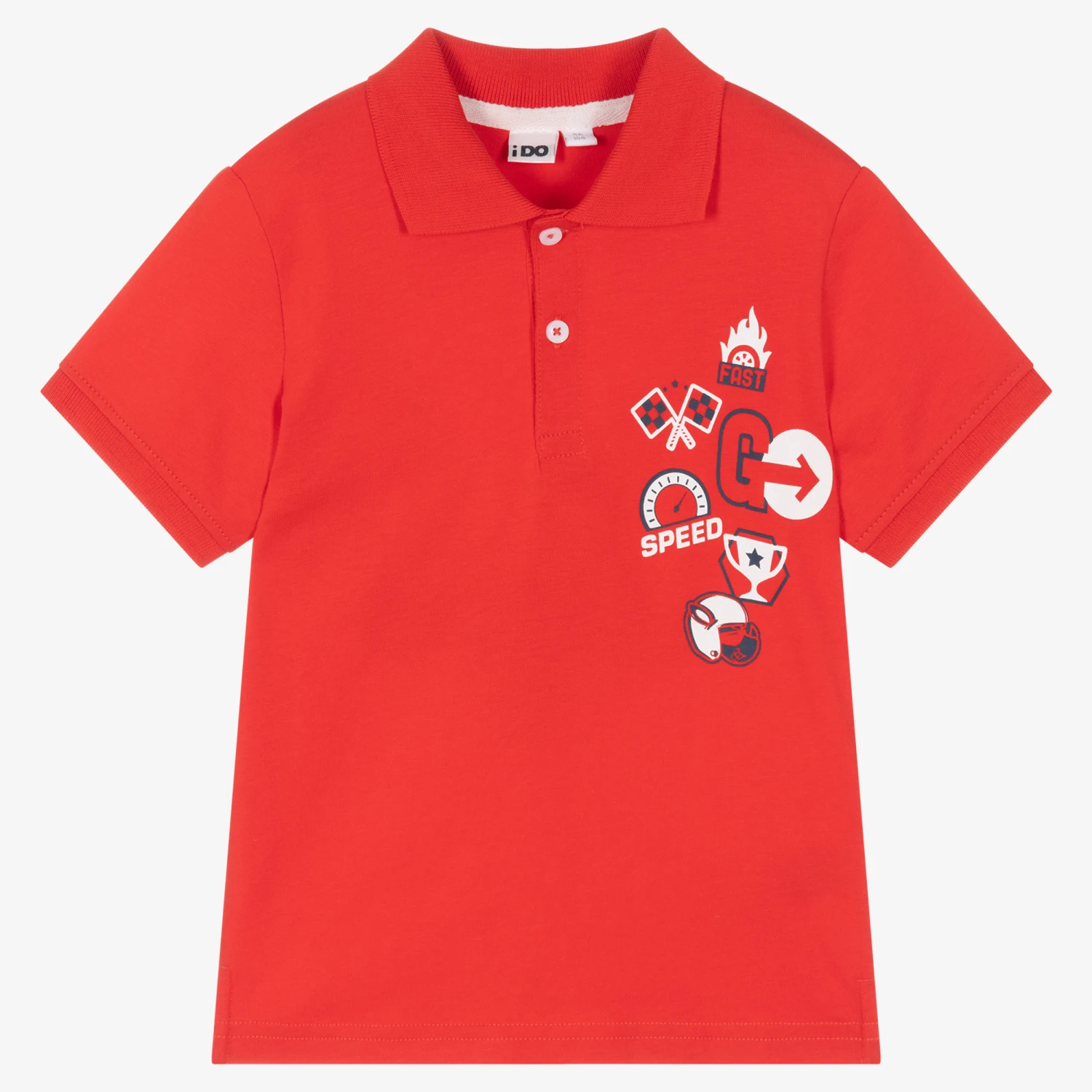 Casual red red polo shirt for boys by iDO Baby, with a cool ‘Speed’ graphic on the chest. Made in soft and comfy cotton jersey, it has a ribbed collar and cuffs, with brand button fastenings.