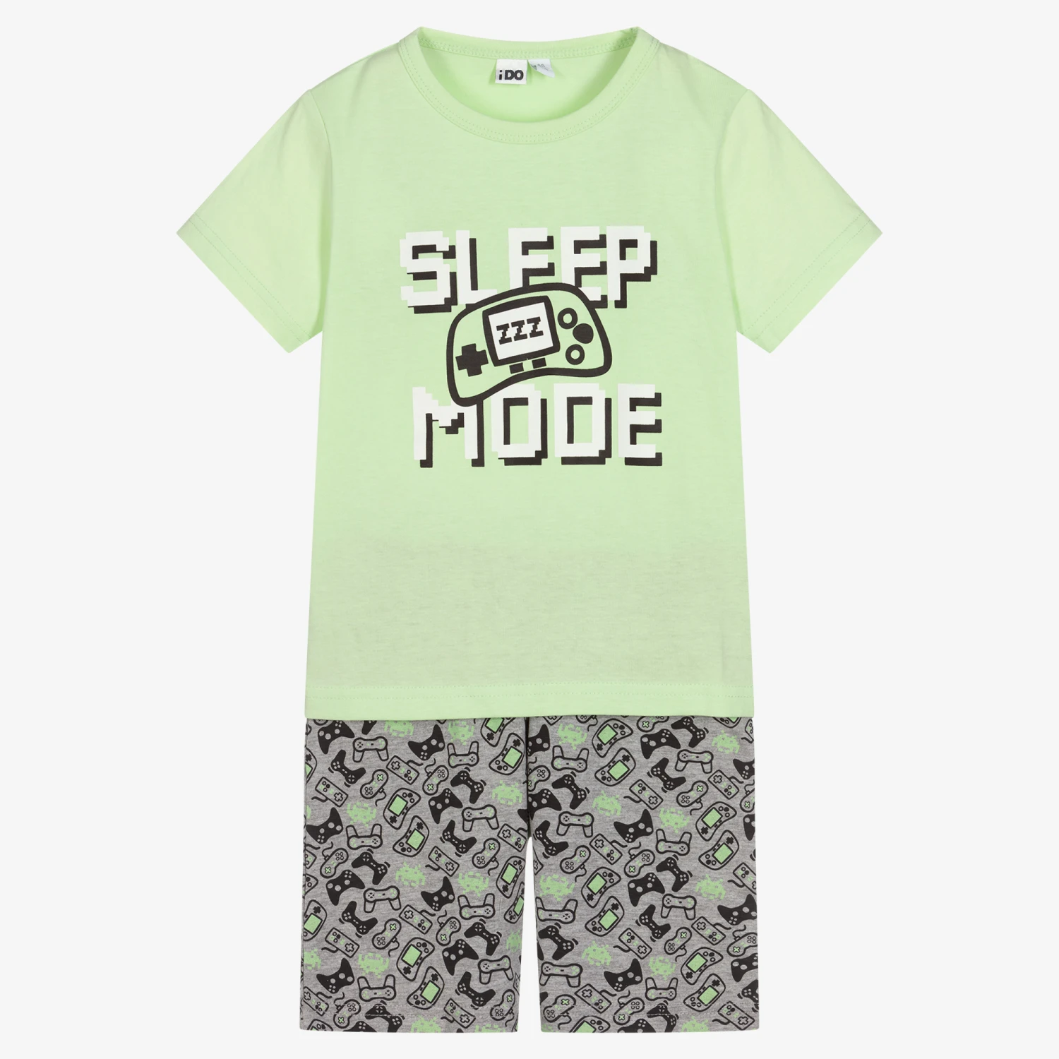Pale green and grey pyjamas for little boys by iDO Baby. Made with soft, stretchy and lightweight jersey, both pieces have gaming-themed prints with controllers and digital-style lettering in green, white and black. The top has a comfortable crew neckline and the shorts have an elasticated waist.