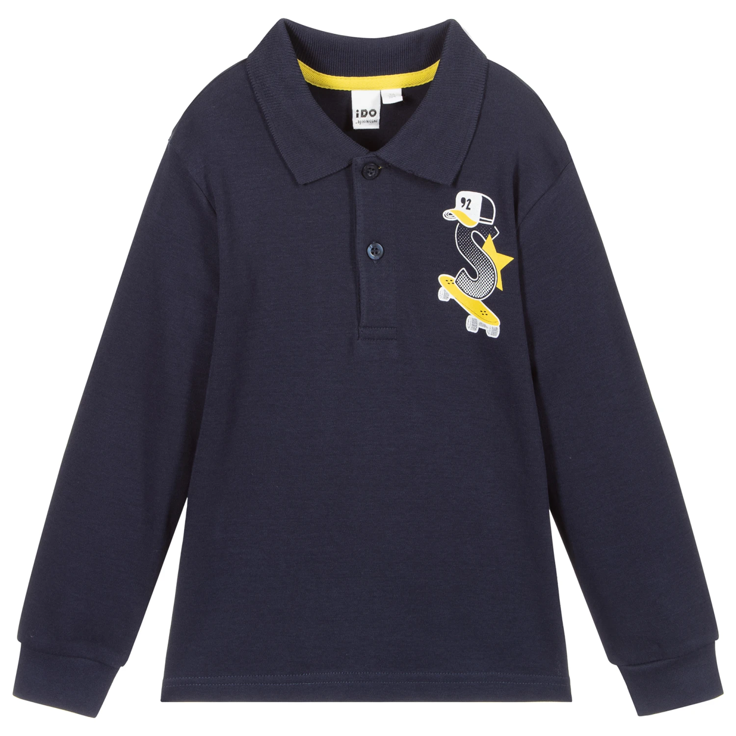 Navy blue polo shirt for boys by iDO Baby, made in soft and stretchy cotton jersey with a yellow and white skateboarding motif printed on the chest.