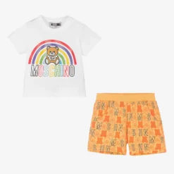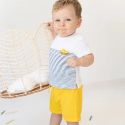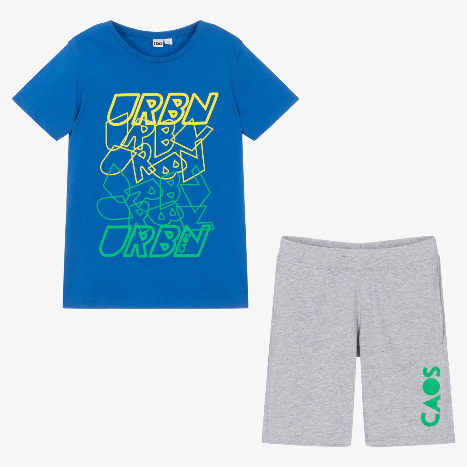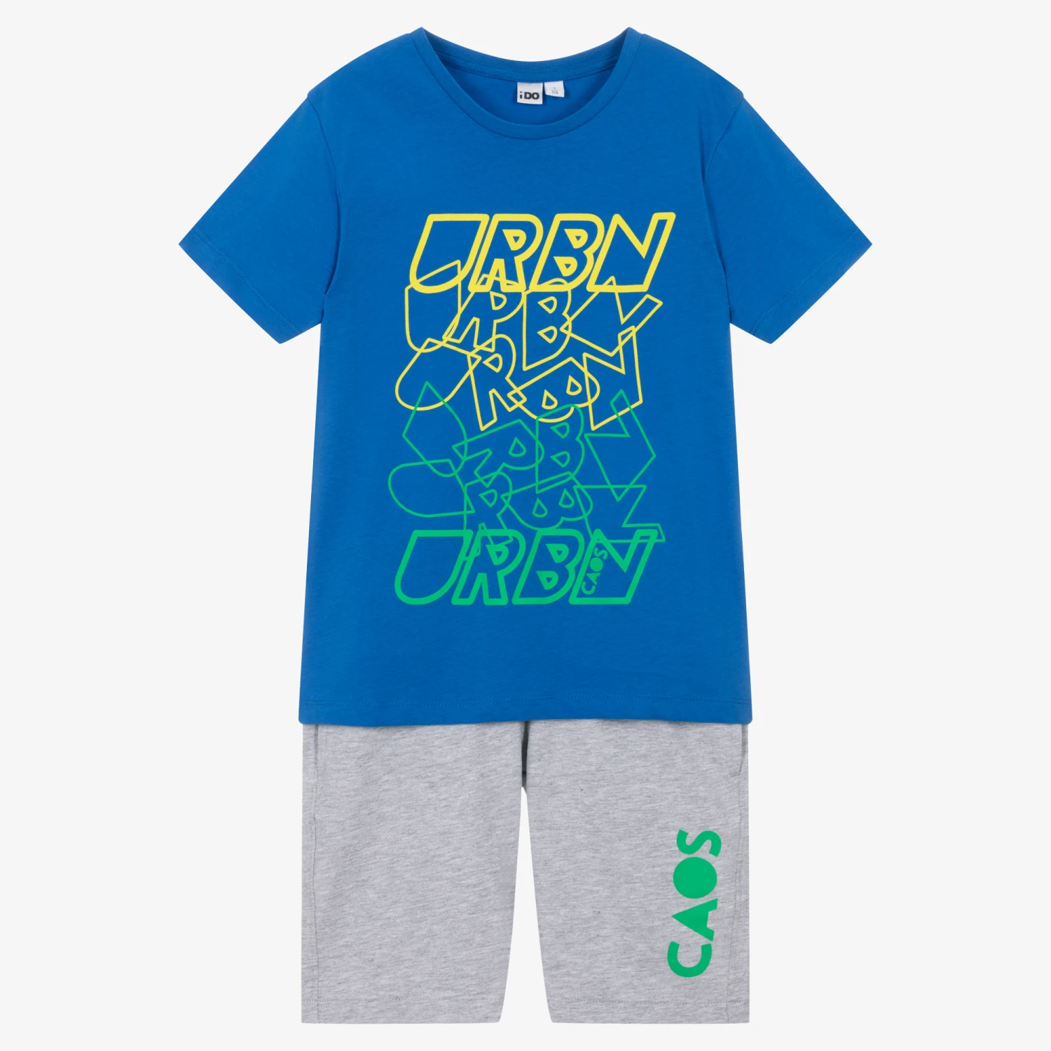 A blue and grey shorts set for boys by iDO Junior, made in the softest cotton jersey. Cool and casual, the crew neck top is patterned with abstract urban-style letters, in yellow and green. To complete the look, the shorts have a matching graphic print, with a comfy internal drawstring waist and side seam pockets.