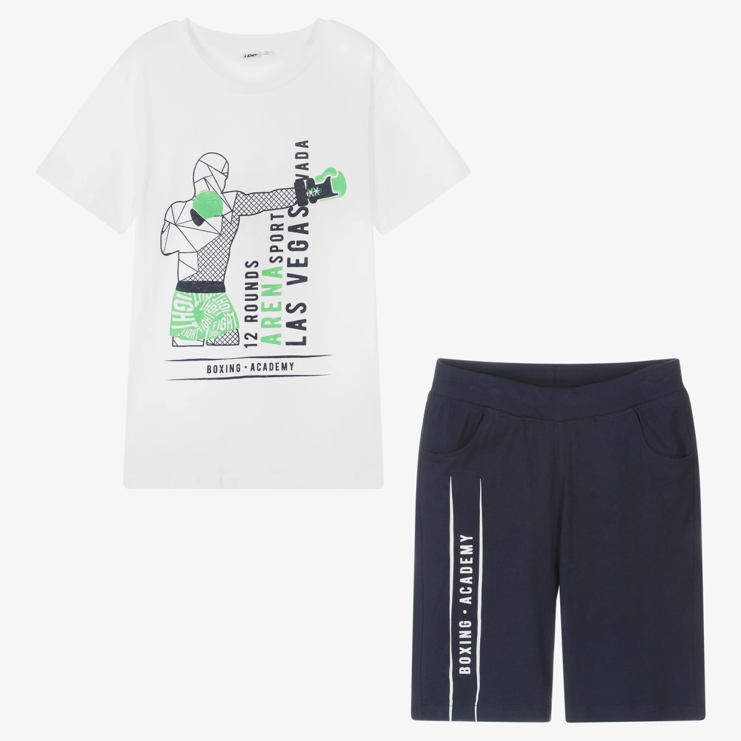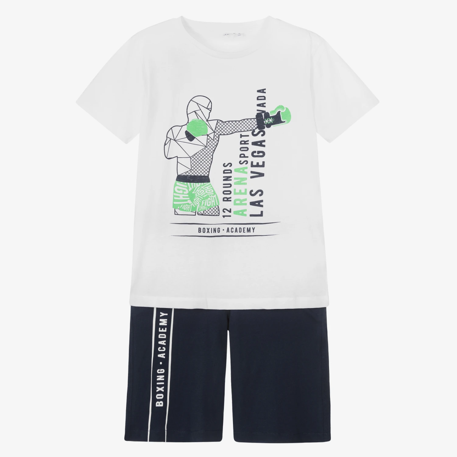 White and navy blue shorts set for boys by iDO Junior, made in soft and stretchy cotton jersey. The white T-shirt has a navy blue and green boxing themed print on the front. The navy blue Bermuda length shorts have a white ‘Boxing Academy’ print on one leg and front pockets. The ribbed waistband has a useful internal drawstring for a comfortable fit.