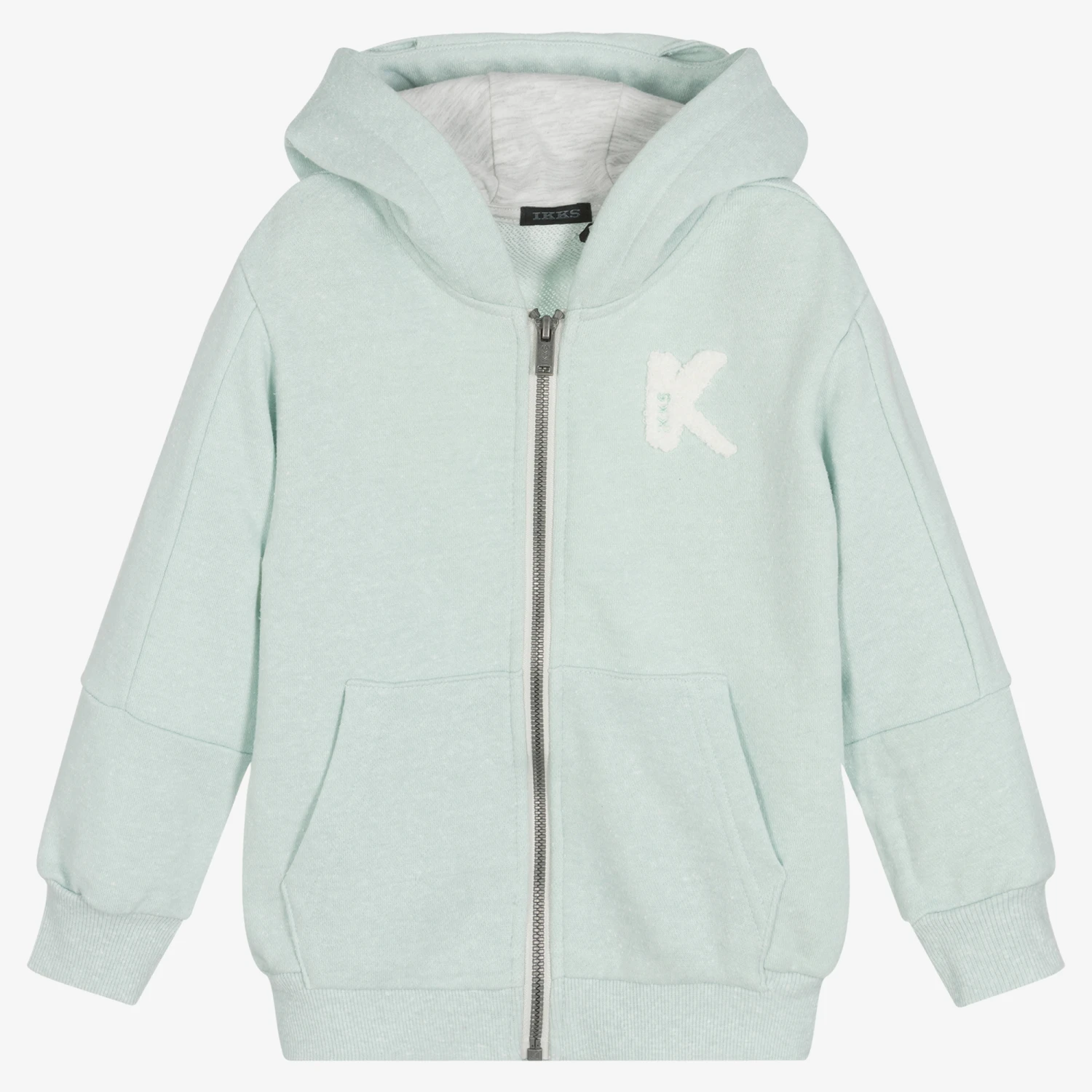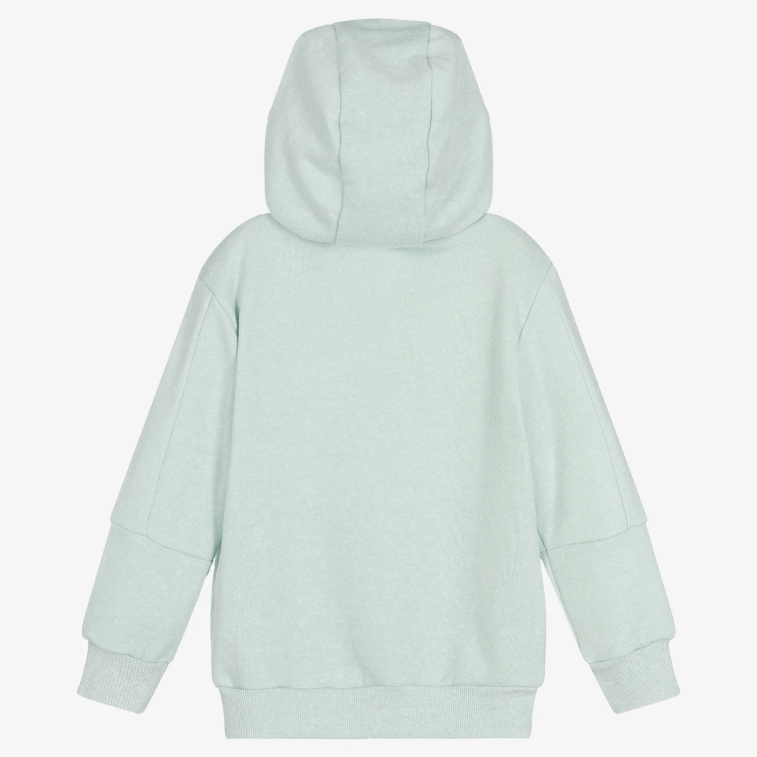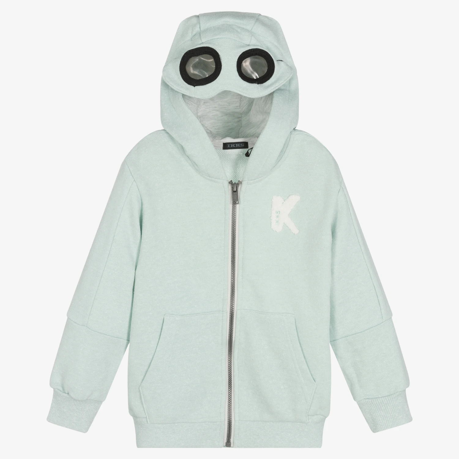 Aqua green hooded zip-up top for boys by IKKS, with a fun goggle eye-mask flap that secures with poppers. Made in lightweight cotton-blends sweatshirt jersey, it has a pouch pocket on the front and ribbed trims. A branded zip pull and a white bouclé logo appliqué add designer style.