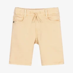 Ivory-beige shorts for boys by IKKS, made in soft and comfy mid-weight jersey. They have a comfortable elasticated waist that adjusts slightly with a drawstring tie. There are five pockets and a branded patch on the back for a subtle designer touch.