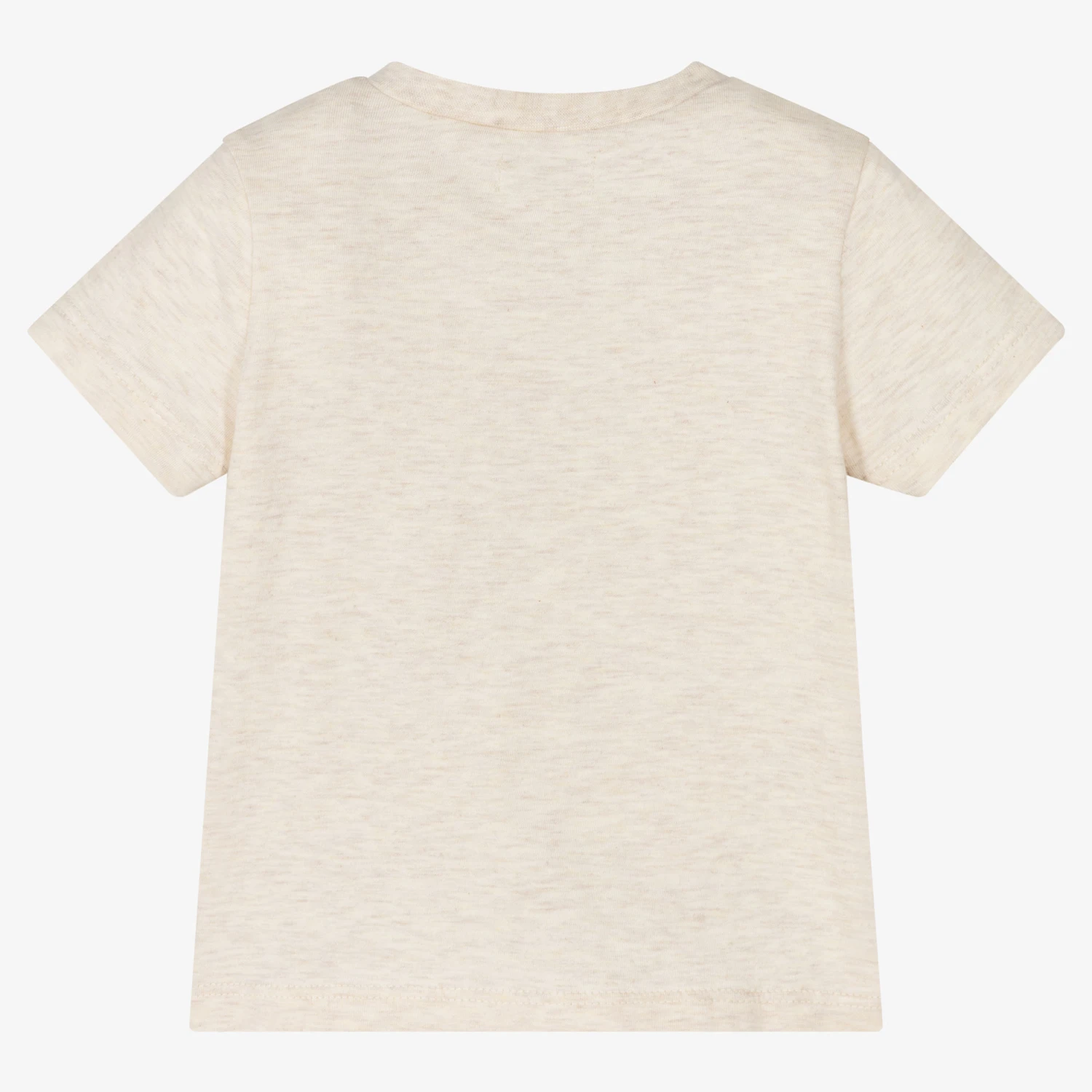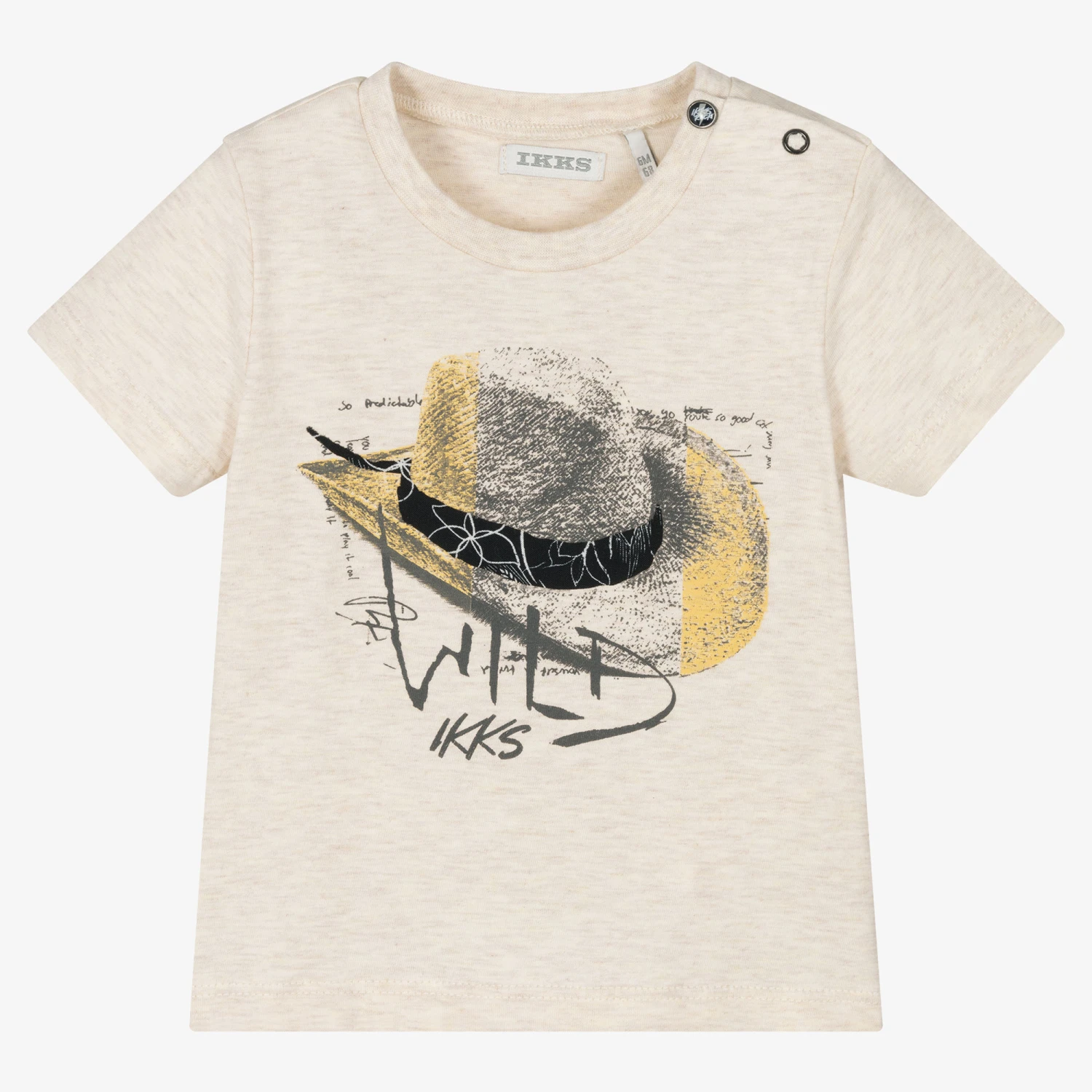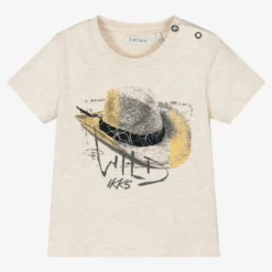 Beige marl T-shirt for little boys by IKKS, with a ‘wild’ cowboy hat printed in yellow and grey on the front. Made in soft and comfortable cotton jersey, it fastens with poppers on one shoulder to help with dressing.